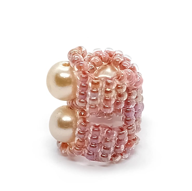 This unique, freehand beaded dreadlock bead is a true one-off, made with shimmering peach seed beads and soft faux pearl accents. Designed without a pattern, using a mix of beading techniques, this piece forms an organic, asymmetrical shape that stands out with quiet elegance.