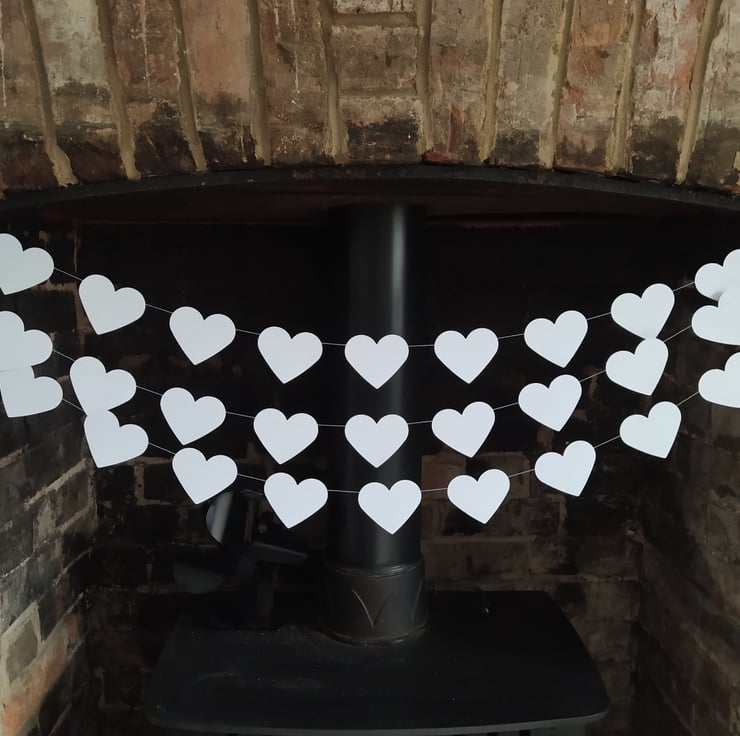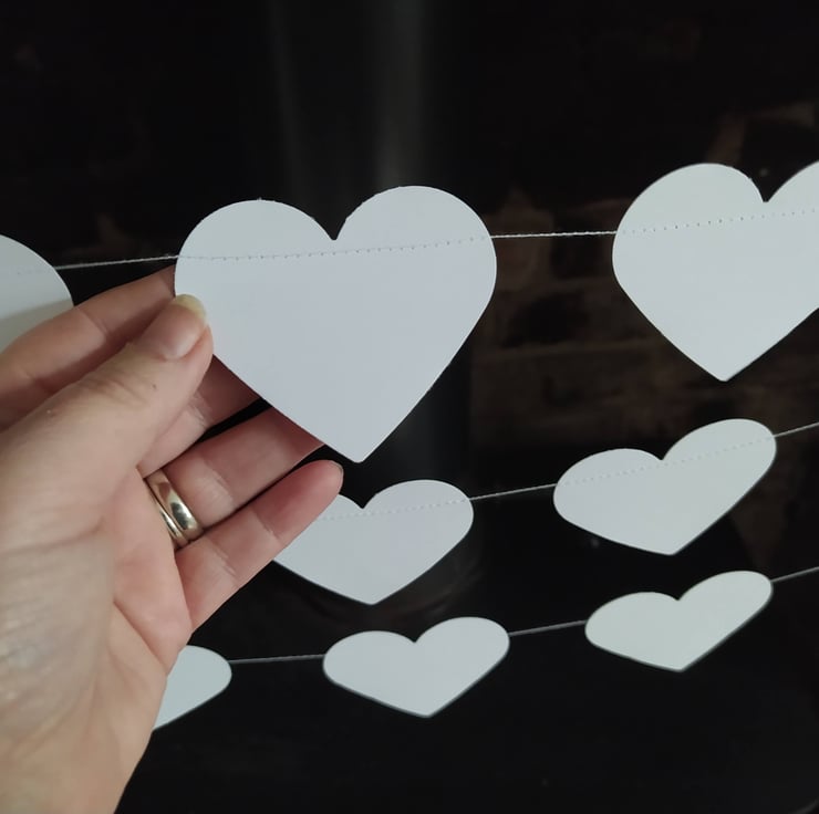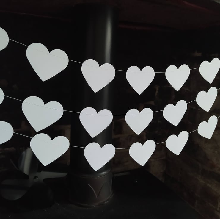 Crafted with love and attention to detail, this exquisite garland features 12 charming white hearts per meter, each measuring 2 inches. Every heart is meticulously hand-punched from high-quality 300gsm British cardstock, ensuring durability and a touch of sophistication. The hearts are expertly stitched together and adorned with a satin ribbon loop at each end, making it a breeze to hang them effortlessly anywhere in your home or venue to create a whimsical atmosphere.