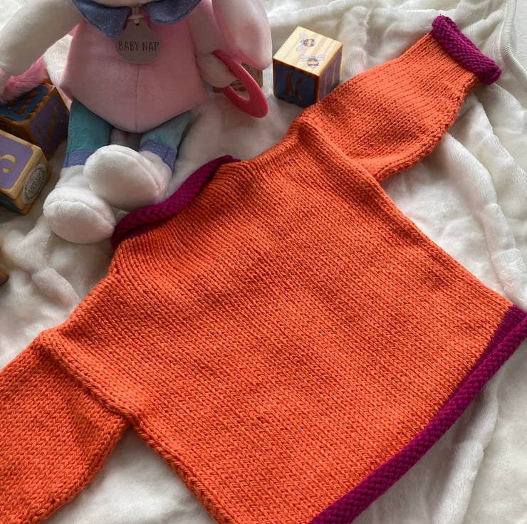 Hand knitted baby girl’s jumper. I have knitted this jumper in an orange coloured beautifully soft pure cotton yarn with contrasting raspberry yarn trim around the neckline, cuffs and hemline. The soft cotton yarn makes this jumper warm yet breathable for your little one.