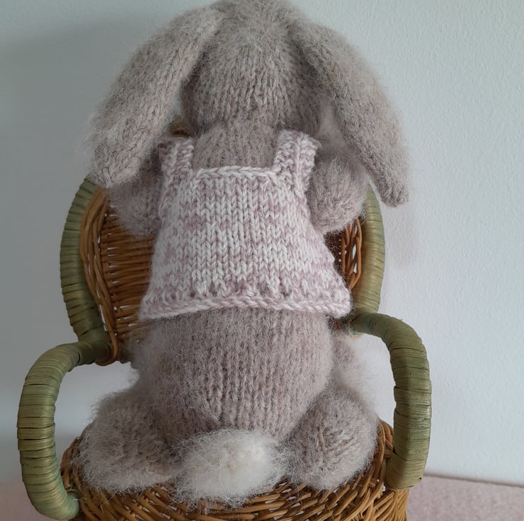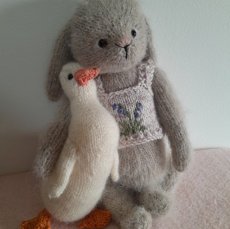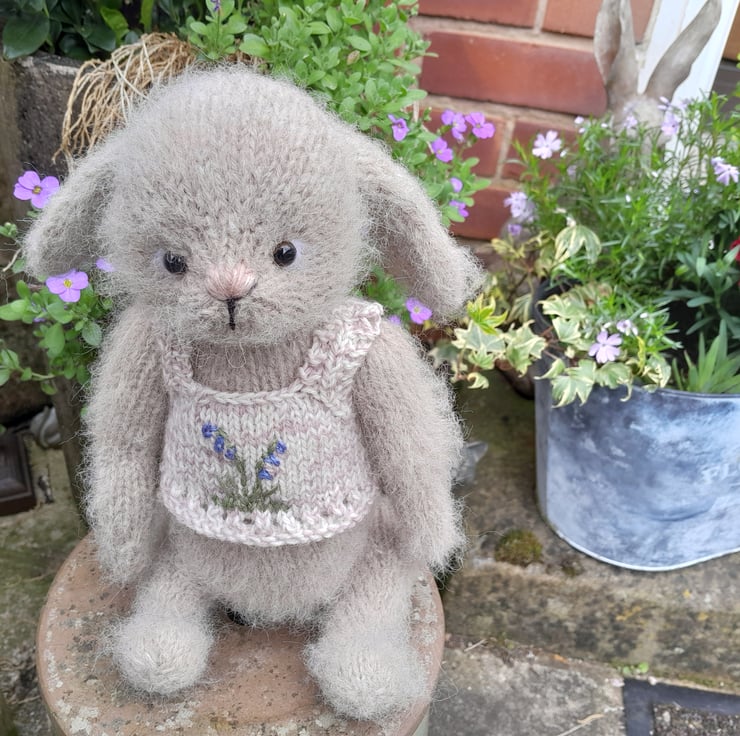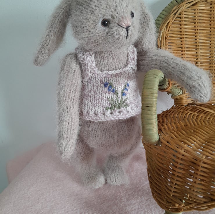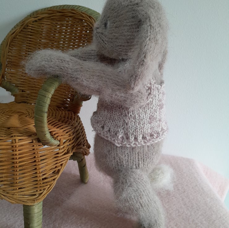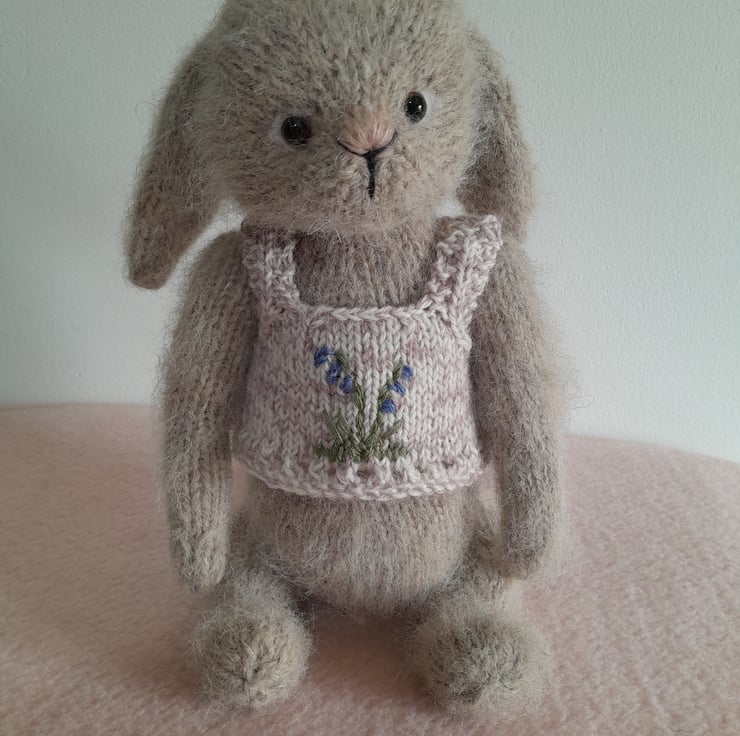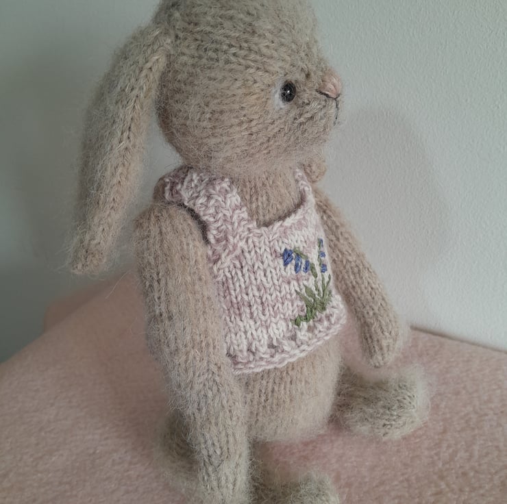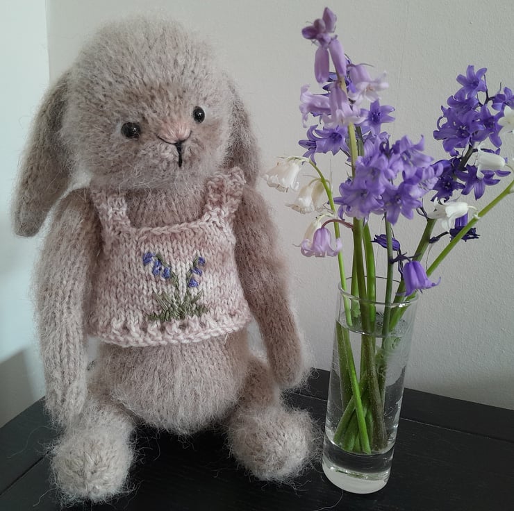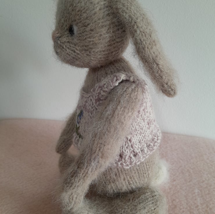 This new little bunny measures just 8".sitting and will become a regular addition to my collection of some realistic and some cute animals. Bluebell bunny is knitted in my favour yarn of alpaca and brushed silk with extra hand brushing to create a soft finish. She has jointed arm and legs which allow for some positioning.