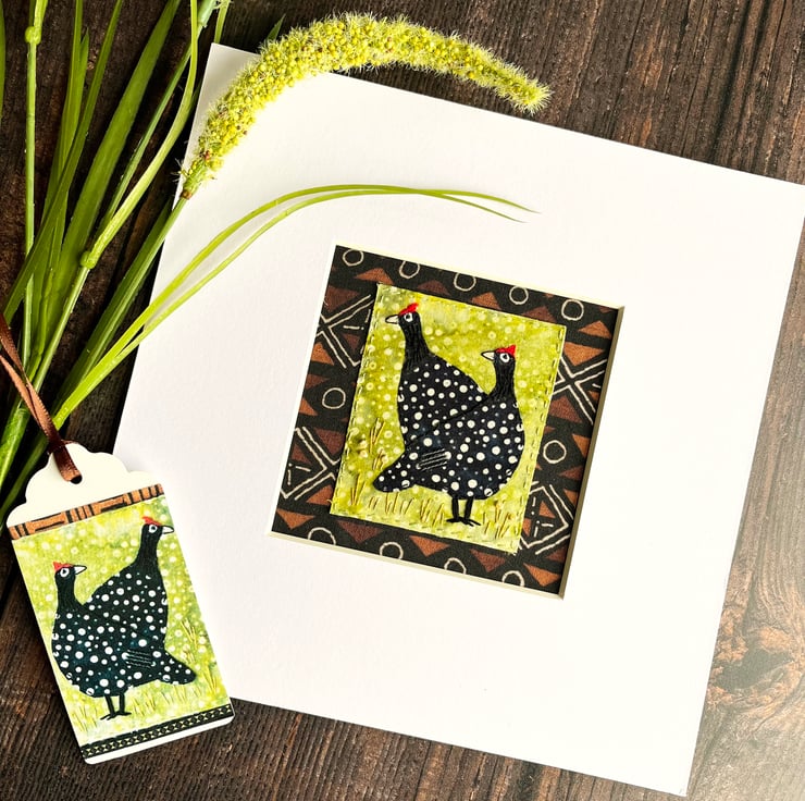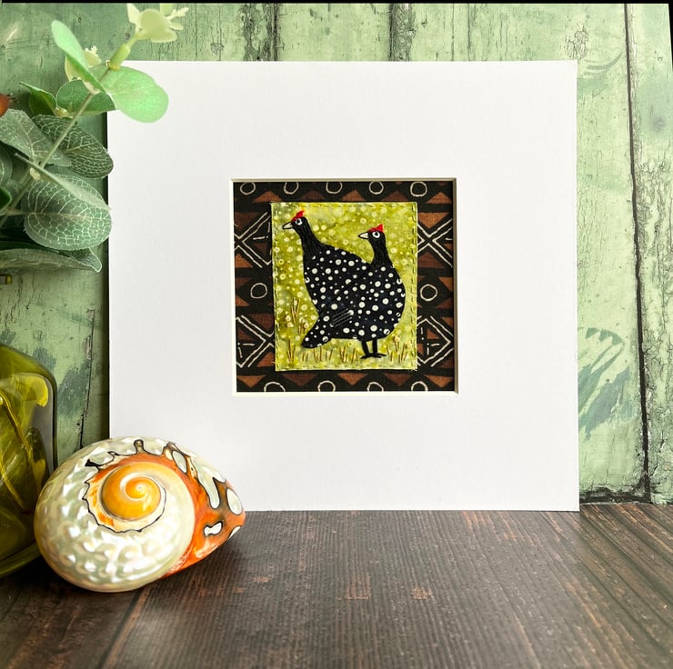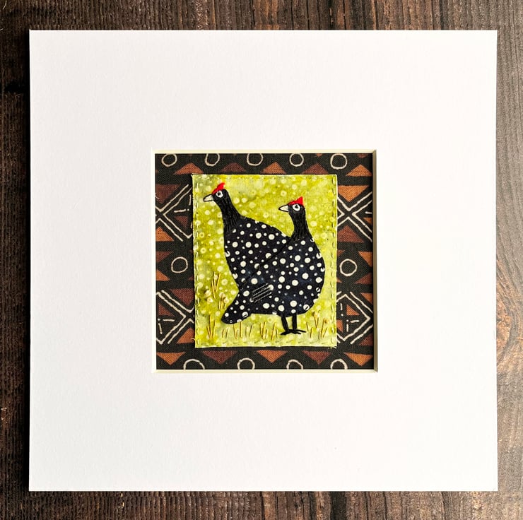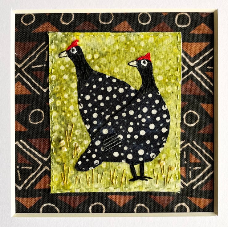 I've used pale green batik behind the birds and added some embroidery threads and white seed beads to represent grasses. The guineafowls' plumage is made with spotted batik and I've used embroidery thread to add details to the head and neck. The panel is hand sewn onto cotton fabric which has a striking African mudcloth pattern.