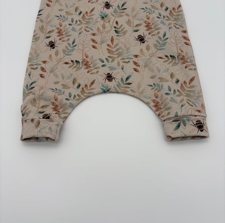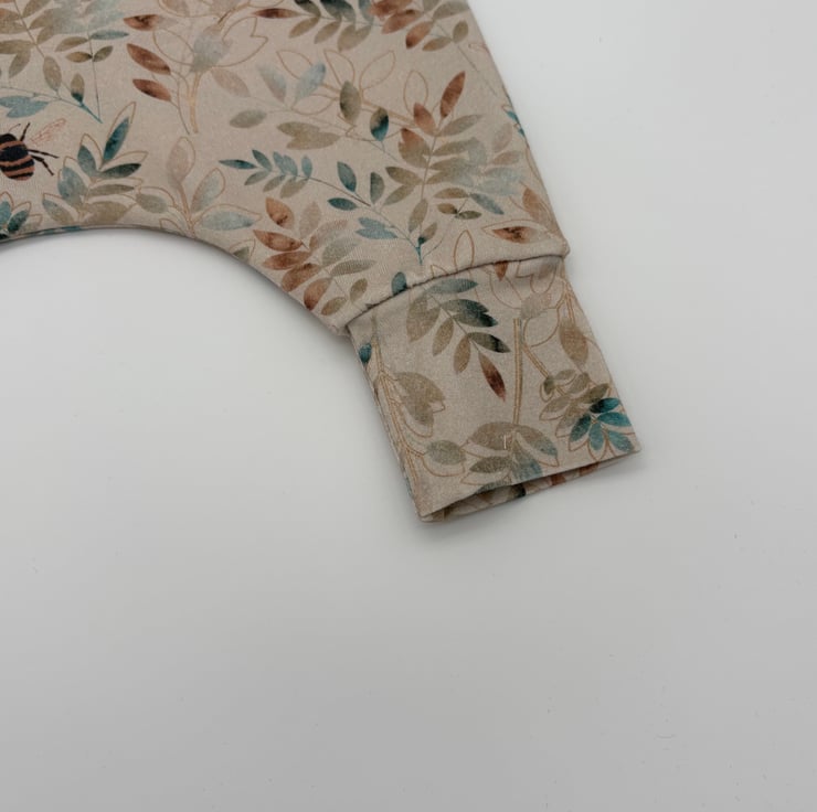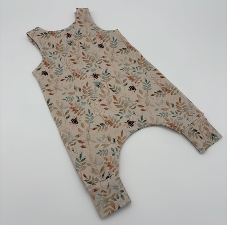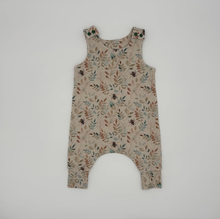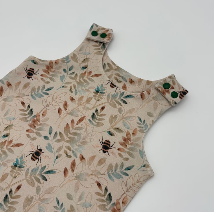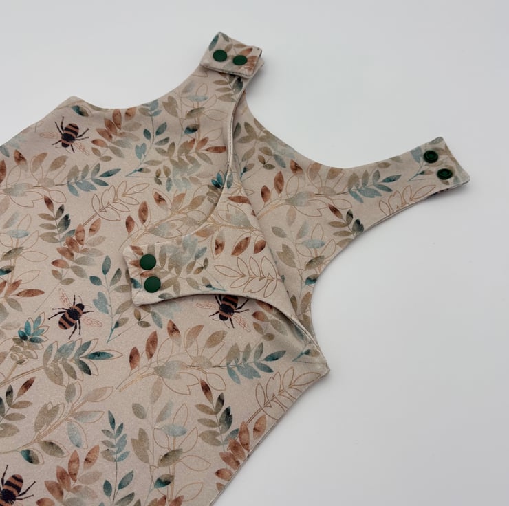 Made to order baby romper in a bee and foliage print with matching cuffs. Made to order in various sizes from 0-3 months to 3-4 years.