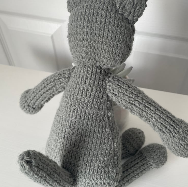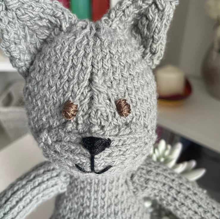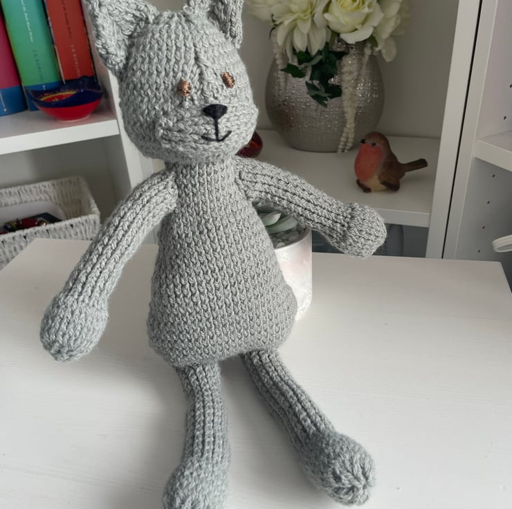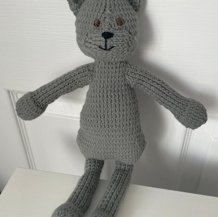 Cat is hand knitted from grey double knitting wool and is filled with soft toy filling which complies to BS1425, BS5852 and EN71 standards. The eyes are hand embroidered with brown double knitting wool. The muzzle is knitted grey double knitting wool with mouth and nose details in black embroidery silk.