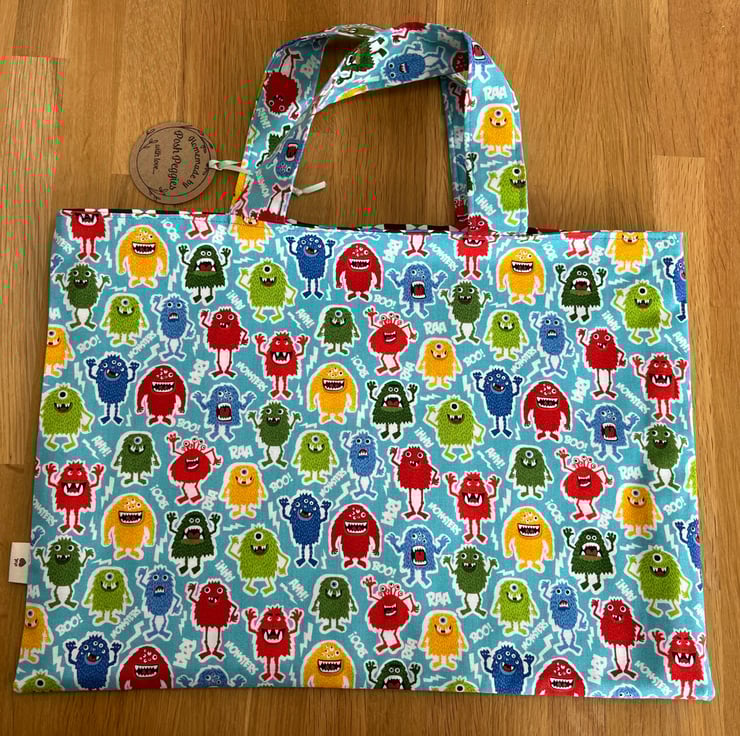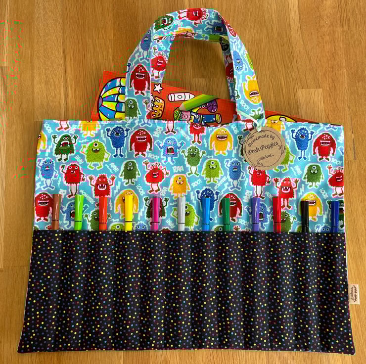 A handy bag to keep all your colouring books pens and pencils together. This bright and colourful bag has a sectional pocket to the front with 12 slots for pens or pencils. Measuring 25cm high by 36cm wide, handles 30cm long. Colourful monster fabric to the outer, black with multi colour spot pocket and hexagon multicoloured print fabric for the lining. BAG ONLY CONTENTS NOT INCLUDED.