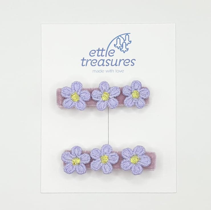 Handmade Lilac velvet fully lined alligator hair clips with cotton sewn Lilac daisies, perfect summer vibe.