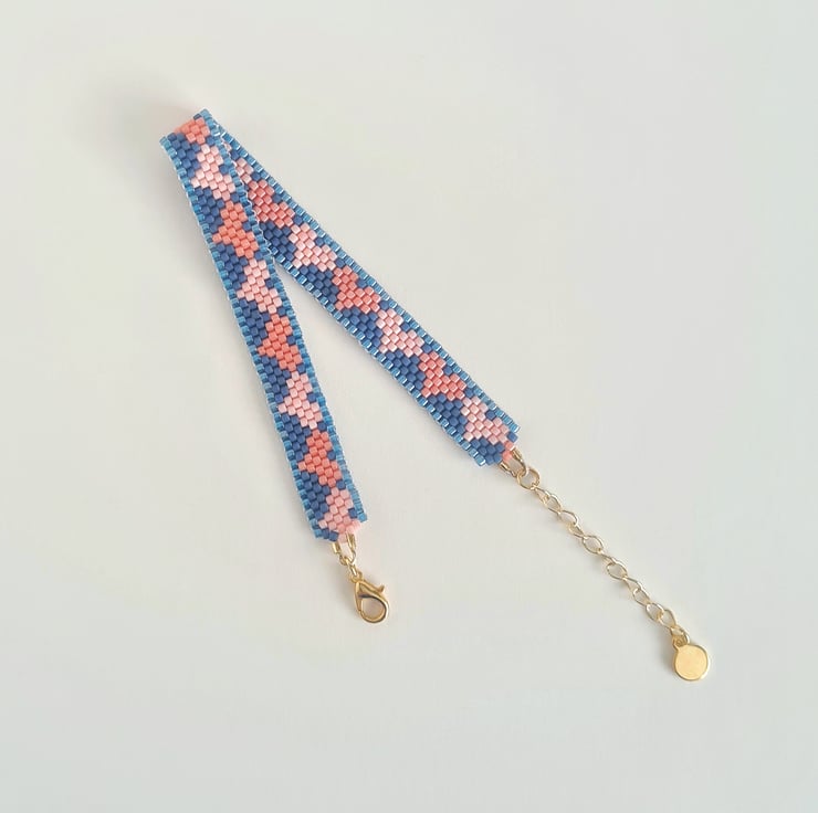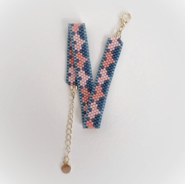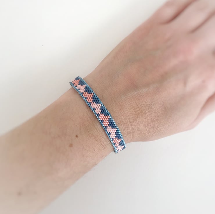 This unique bracelet was made using beautiful tiny Japanese glass beads called Miyuki Delica. There is a mix of matt and luster beads and it beautifully catches the light when worn.