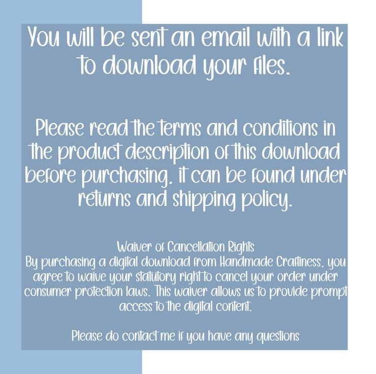 No Refunds for Digital Downloads Refund Policy for Digital Downloads Acceptance of Terms By completing your purchase, you acknowledge and accept this refund policy. At Handmade Craftiness, we are committed to providing high-quality digital products. Please read our refund policy carefully before making a purchase: Waiver of Cancellation Rights By purchasing a digital download from Handmade Craftiness, you agree to waive your statutory right to cancel your order under consumer protection laws. This waiver allows us to provide prompt access to the digital content. No Refunds After Download For digital downloads, consumers are required to waive their cancellation rights before the digital content can be provided. This means that once a customer (i.e., the consumer) has downloaded the content, they have given up their consumer rights to a refund. This policy aligns with consumer law for digital goods, ensuring the protection of intellectual property and preventing unauthorized distribution. Cancelling a Digital Download Under the Consumer Contracts Regulations 2013, digital downloads are neither goods nor services, meaning the law is a little different. If you want to download something within 14 days of buying it (known as the 'cooling-off’ period), you must give your consent to waive the 14-day cooling-off period. If you do not give your consent, the 14-day cooling-off period still applies. However, you will not be able to download your digital content until this period has ended. This policy exists to prevent customers from changing their minds after downloading the content. As you are being sent a link via email to download after purchase this will count as downloading the content as you will have access to download the files from the email. Eligibility for Refunds Refunds may only be issued under exceptional circumstances, such as: The digital content is proven to be defective or incomplete. An error on our part (e.g., duplicate billing). Contact Us If you believe you are eligible for a refund due to one of the exceptional circumstances above, please contact us at orders@handmadecraftiness.co.uk with your order details, a description of the issue, and proof of purchase. Our team will review your request and respond within 7 business days. For further inquiries, please contact us at orders@handmadecraftiness.co.uk. ------------------------------------------------------------------------------------------------------------------------------------------------------------- Ownership and Usage: All artwork within this shop is the exclusive property of Handmadecraftiness. You are expressly prohibited from reproducing, altering, redistributing, reselling, or claiming ownership of any digital item from this store. However, you are permitted to incorporate products from this store into your own physical handmade items for sale as a hobbyist. TERMS OF USE 1. You may print and use these items in a tangible journal/scrapbook/craft project etc. 2. You MAY NOT sell or share these files. 3. You MAY NOT reproduce/alter/redistribute our designs as a digital or physical item. 4. You MAY NOT sell or manipulate these files for resale purposes. 5. You MAY NOT share these files individually or as kits.