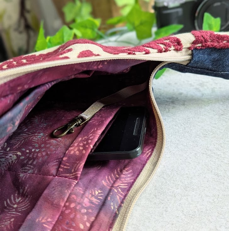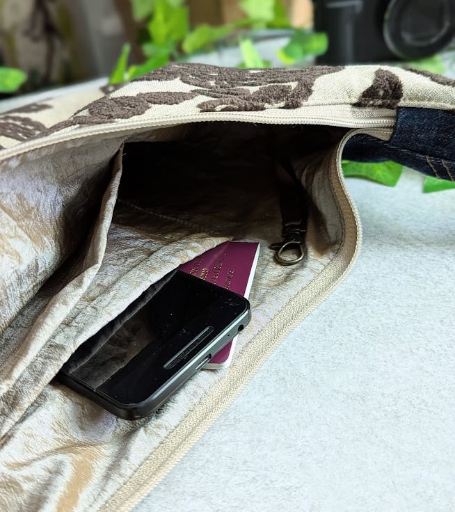 The brown bag is lined with caramel coloured taffeta and the maroon bag is lined with a batik print cotton (see photo) with slip pockets for phone, pens, passport etc.