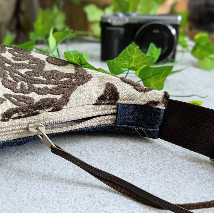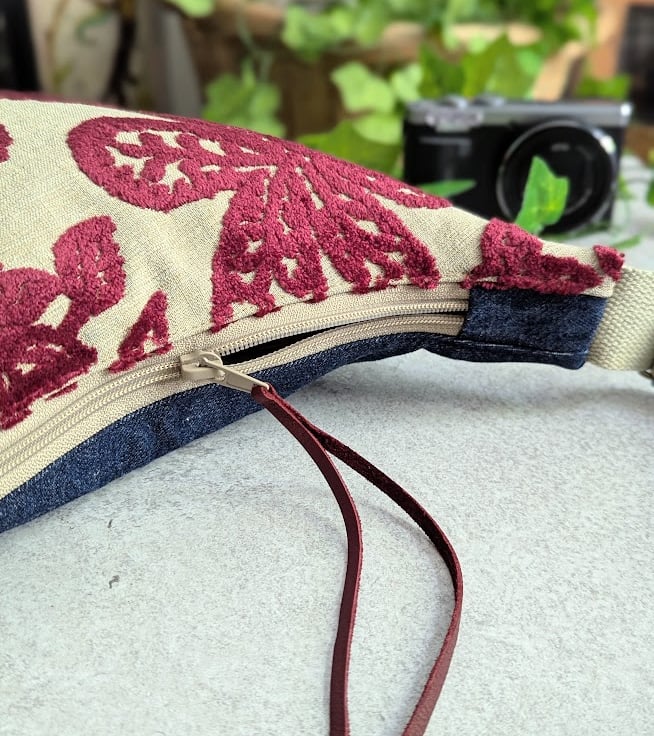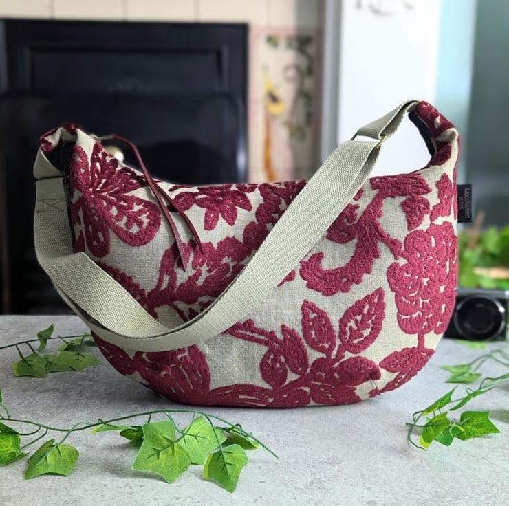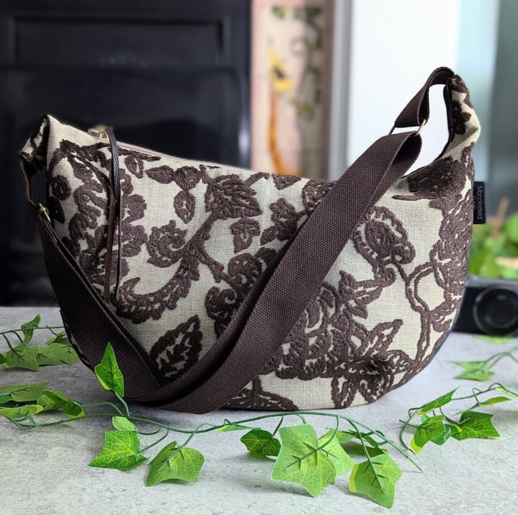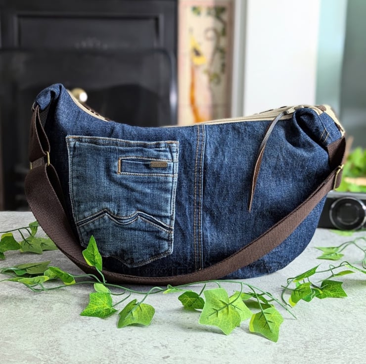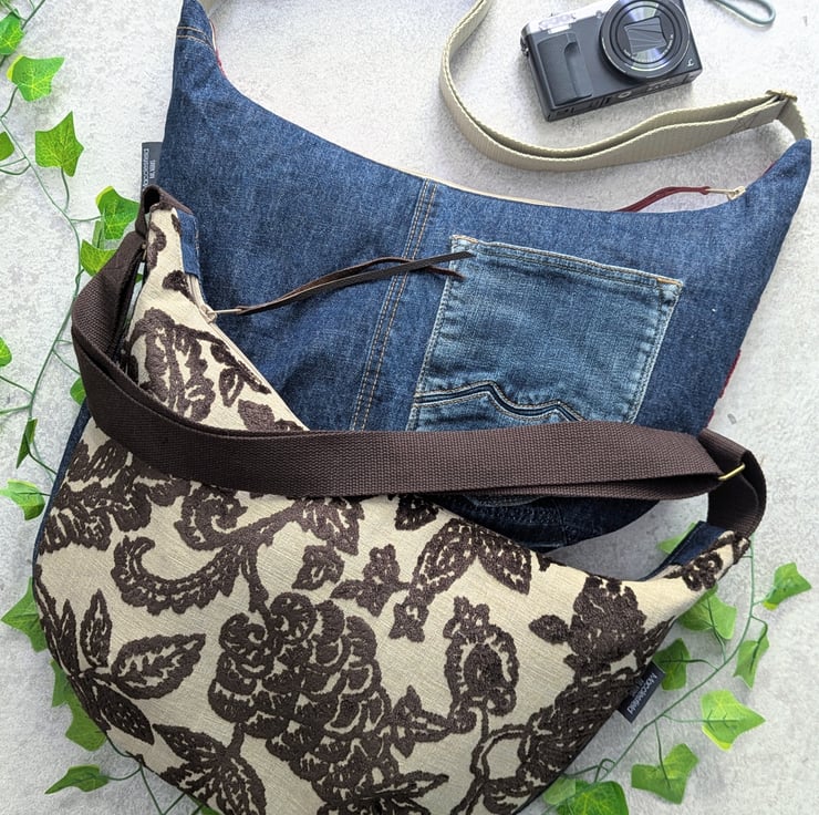 Handmade using upholstery fabric remnants and recycled denim, this cross body large dumpling shaped bag has been designed to be light and casual with a contemporary vibe...and can be worn either way around for two different looks.