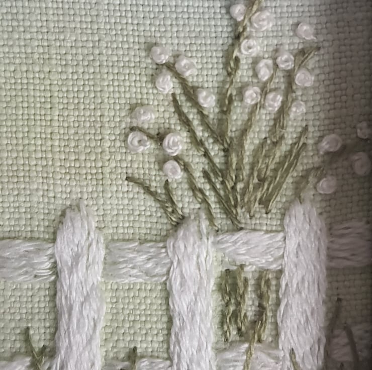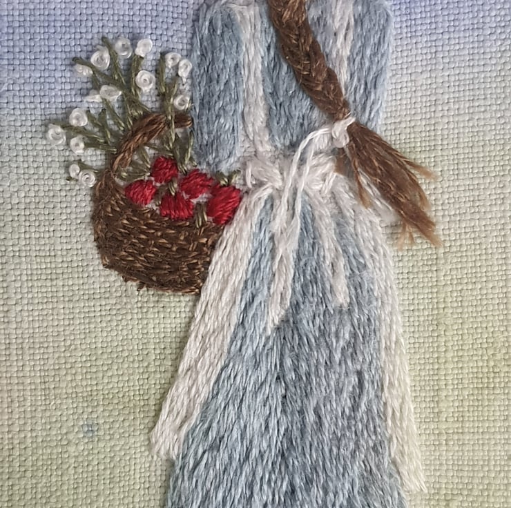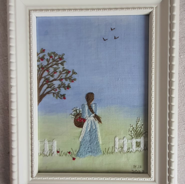This beautiful picture is hand embroidered onto a water colour painted linen background and framed in a white painted frame measuring 23 x 18 cms