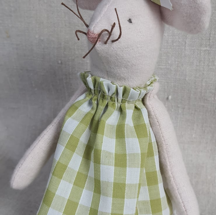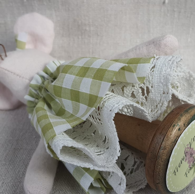 This sweet little soft cotton mouse is sitting patiently on a vintage bobbin waiting to be adopted into a loving home! She has a pretty gingham dress and a vintage lace petticoat. She stands 16 cms tall.