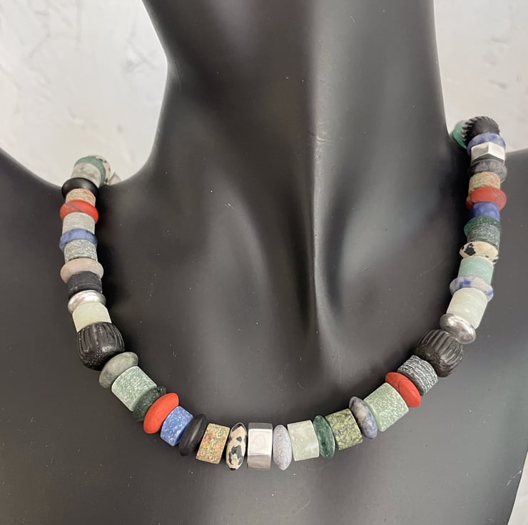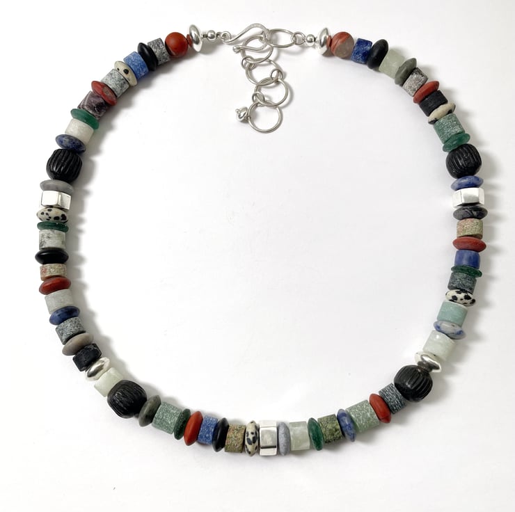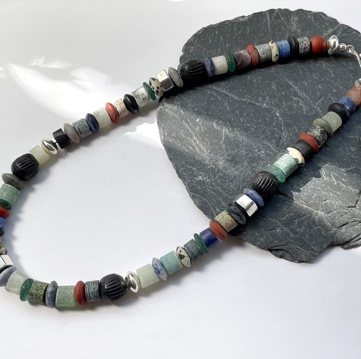 The matte gemstone beads are in a mix of drum and rondel shapes, I have also included a few vintage Peruvian clay beads and some Roman glass beads in the mix.