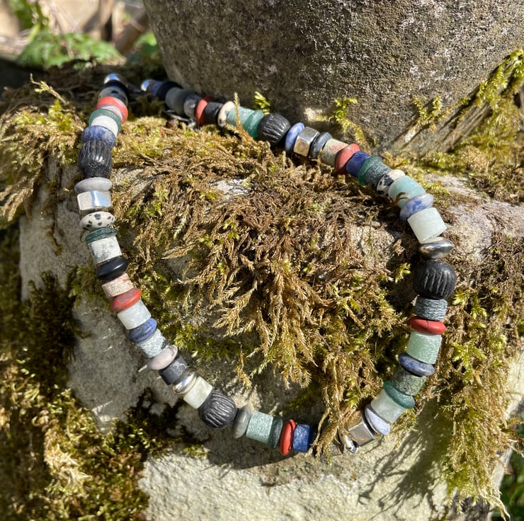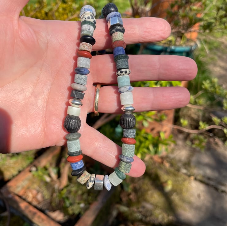 The stones include green aventurine, jasper, amazonite and sodalite amongst others. The black grooved Peruvian beads have been in my stash for over 40 years, they are likely glazed terracotta. The glass beads have been cut from excavated Roman glass.