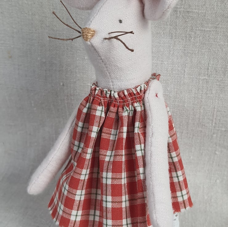 This sweet little soft cotton mouse is sitting patiently on a vintage bobbin waiting to be adopted into a loving home! She has a pretty gingham dress and a vintage lace petticoat. She stands 16 cms tall.