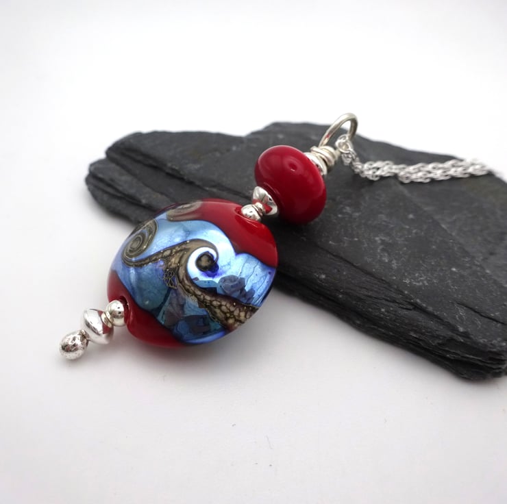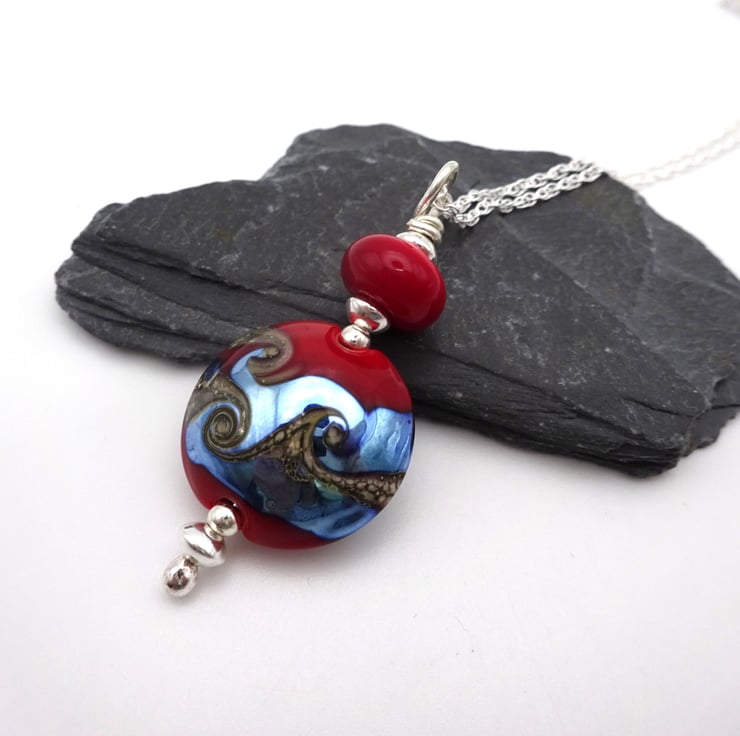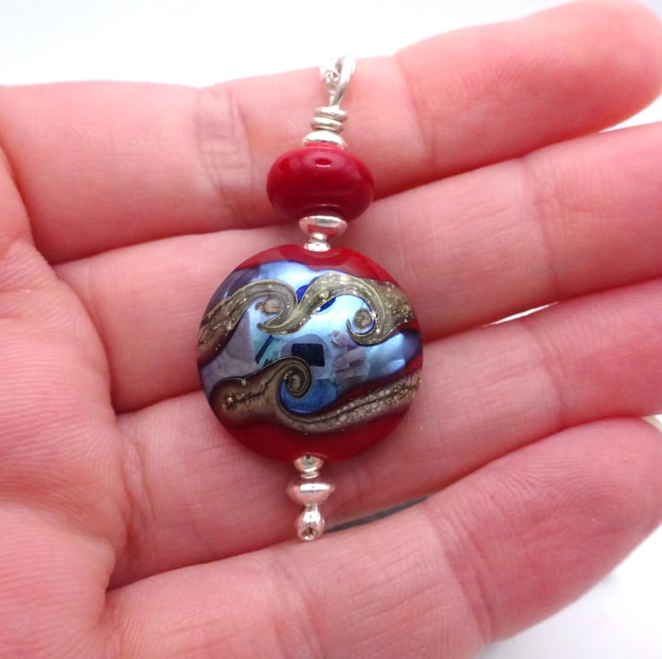 The pendant feature beads made with red and silver glass.