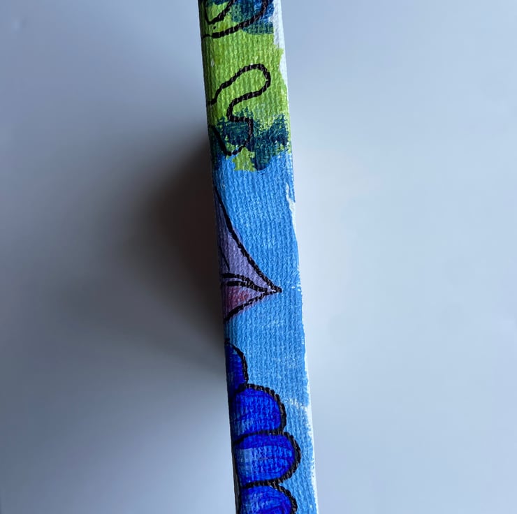 The painting is done in acrylics with pen highlighting. The colours are vibrant but the hues will vary according to the light you view them under.