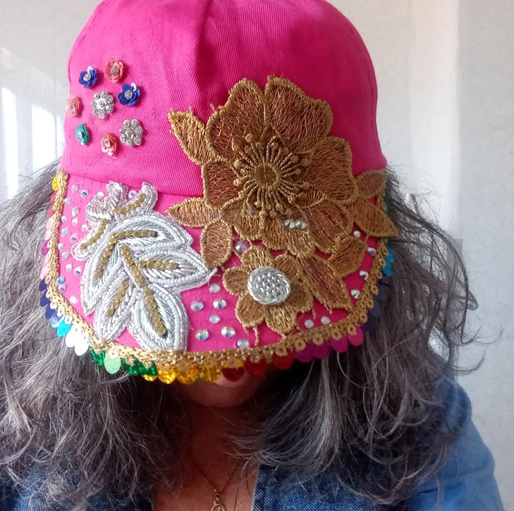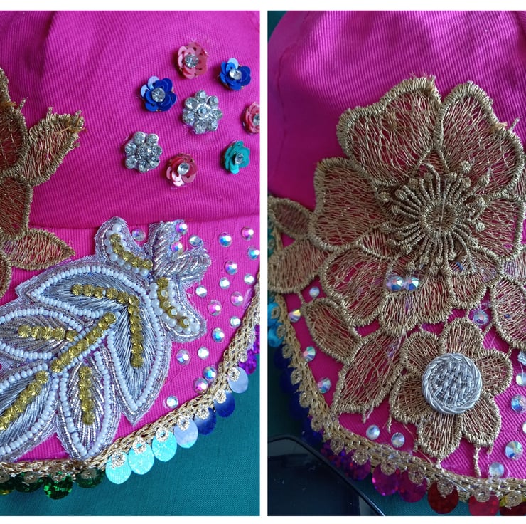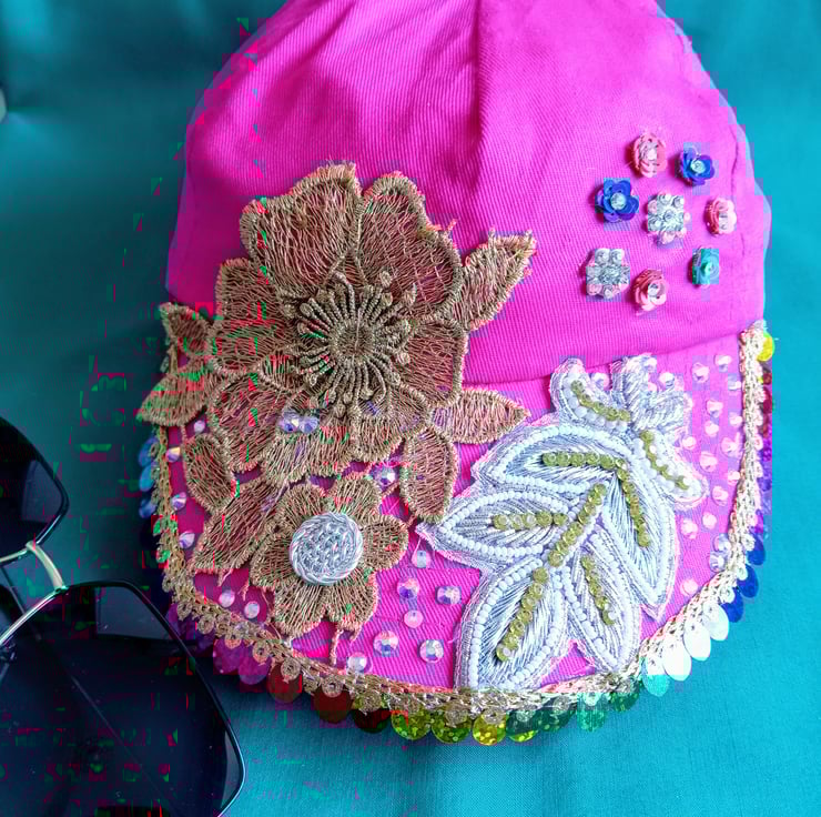 Get Festival Ready with this one of a kind cap that has been hand finished and embellished.