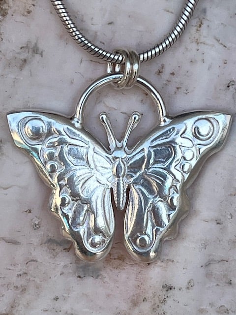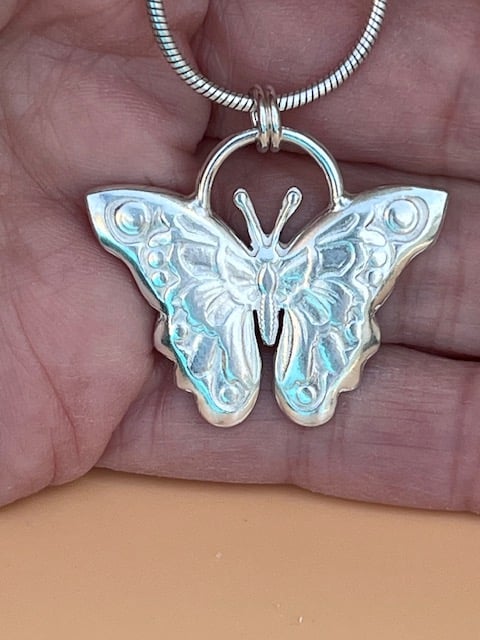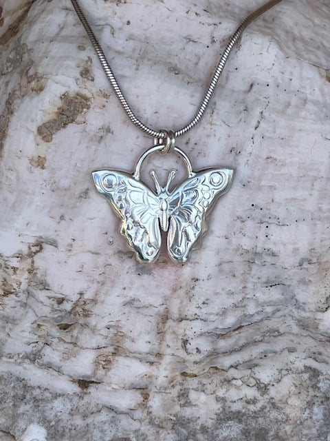 This sterling silver butterfly pendent is hand created by me using an impression die in a press, which is then chased to bring out the details. The silver weight is 6.4 grams.