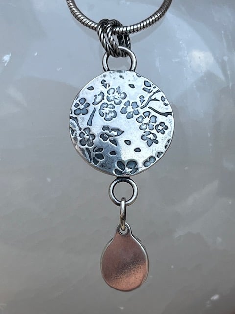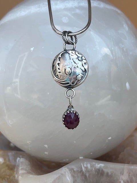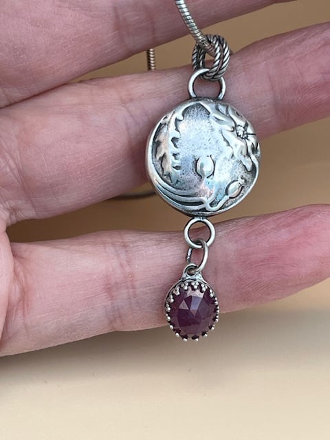 This sterling silver pendent has a poppy design and ruby gem stone. It is hand created by me using an impression die in a press. The design is then soldered to a sterling silver back plate, therefore there is a double layer of silver, making it a nice weight of just over 6.5 grams.