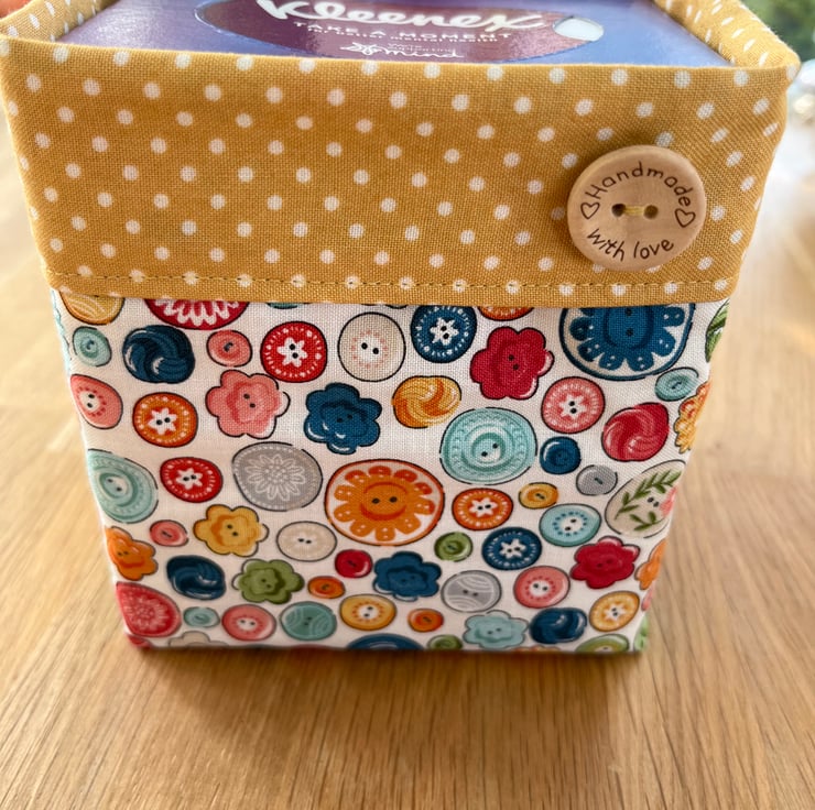 Pretty cover which fits the majority of cubed tissue boxes, fully lined made with 2 contrasting fabrics - for ease of posting sold without box of tissues.