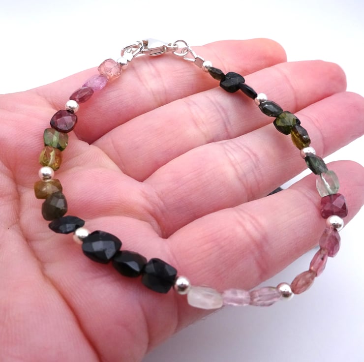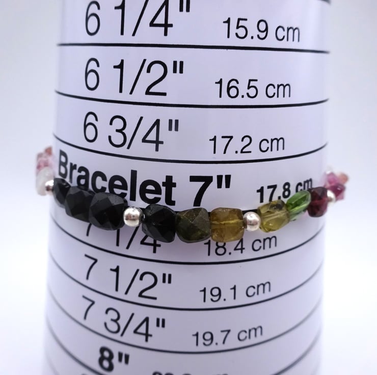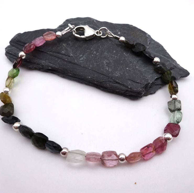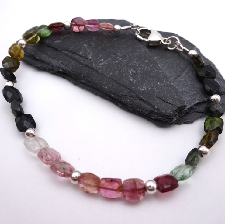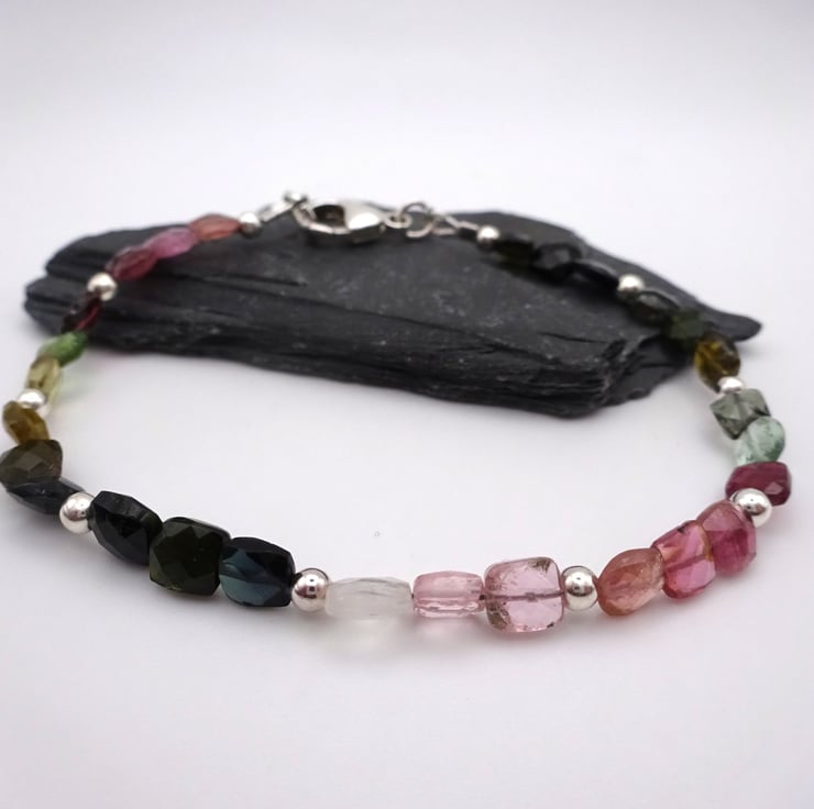 A beaded bracelet made using Grade AA Multi Tourmaline gemstone beads, they have been strung with 3mm sterling silver beads.