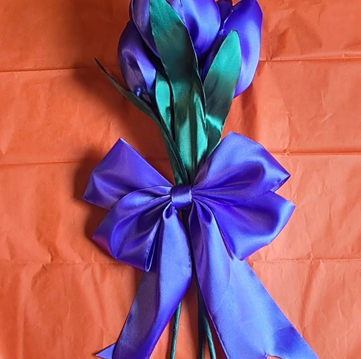 A lovely trio of Purple Tulips made from Purple and Green ribbon with floral wire stems (so can be gently bent and angled for your display). Gorgeous handmade Forever Florals that will outlast real flowers and make an unusual and unique keepsake gift.