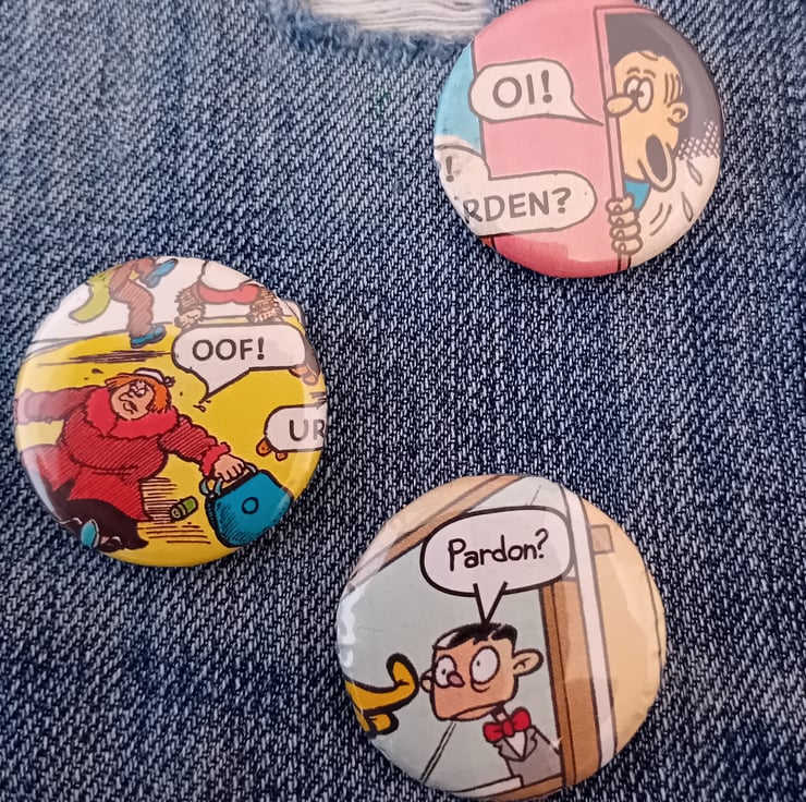 Add a splash of colour and a hit of nostalgia to your outfit with this bold badge, handcrafted from original vintage British comics! Each one is a mini work of pop-art history – no two are the same.