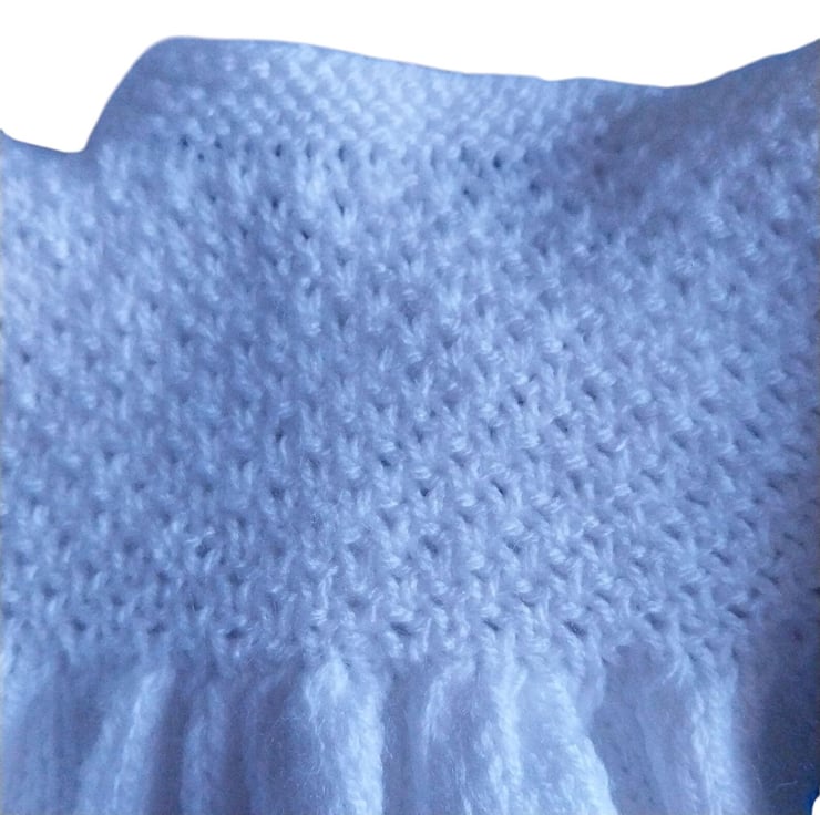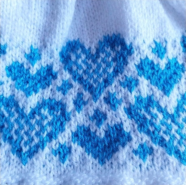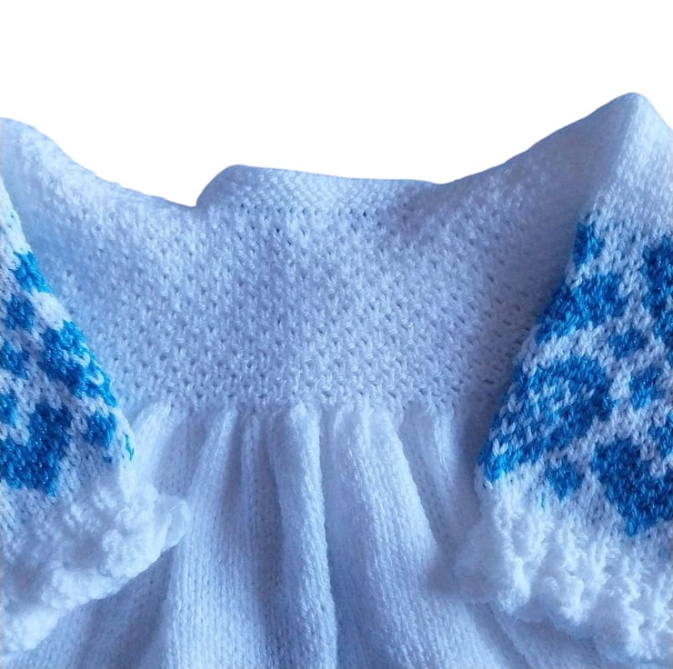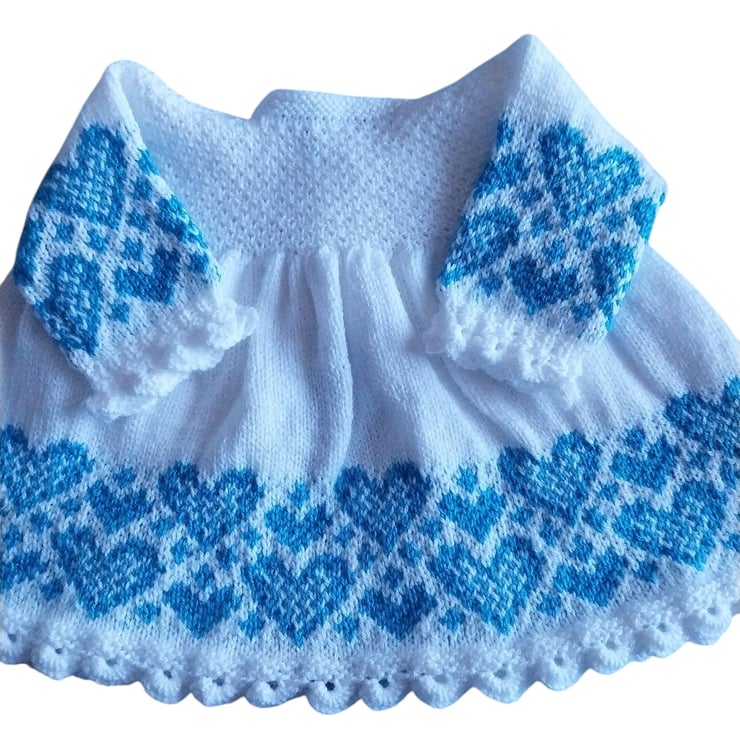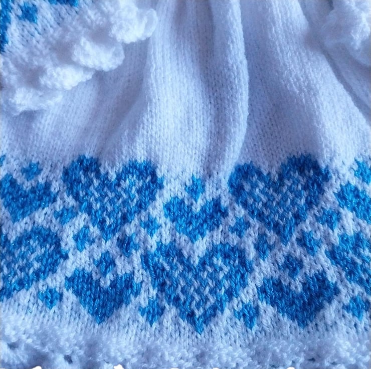 Handmade with love in soft white yarn and detailed with pretty blue hearts, it’s the perfect outfit for a baby shower, keepsake photos, or just a thoughtful gift to welcome a new little one.