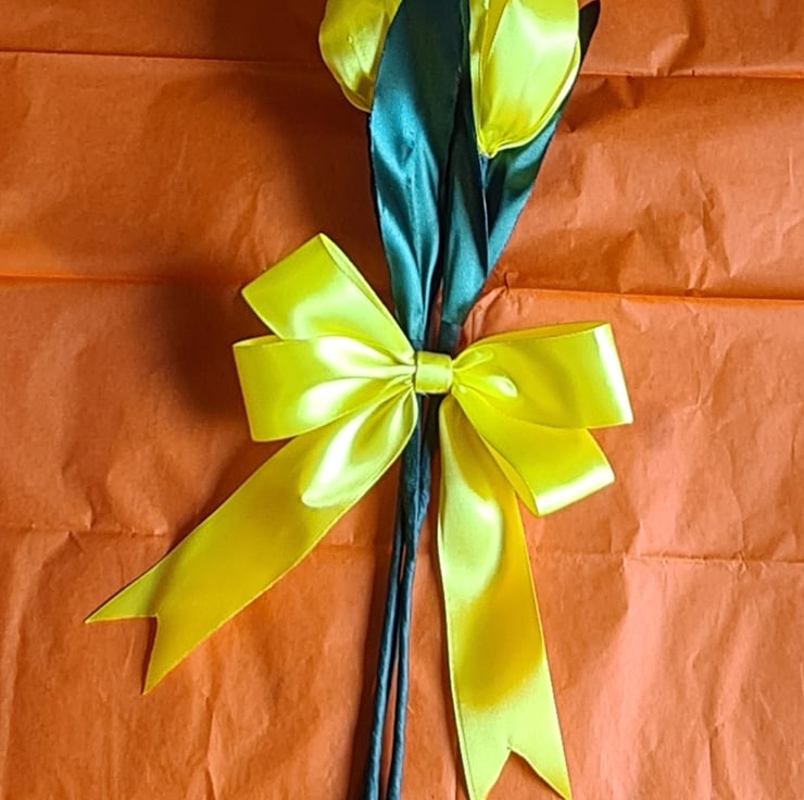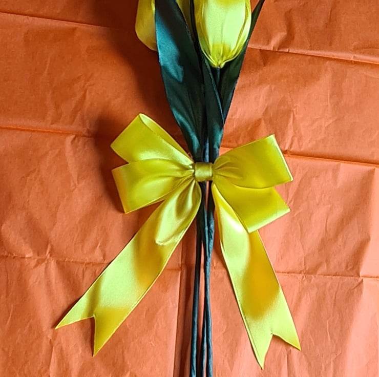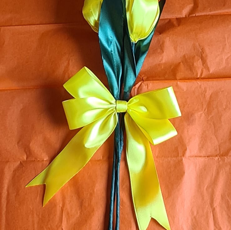 Flowers are individual and have an Yellow Bow with double sided tape. They are approx 40cm high in total and the flower heads are approx 10cm H by 7cm W . Made from Yellow, and Green Satin Polyester Ribbon, Floral wire, Floral tapes and Hot Glue.