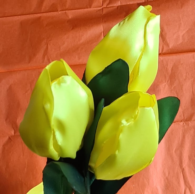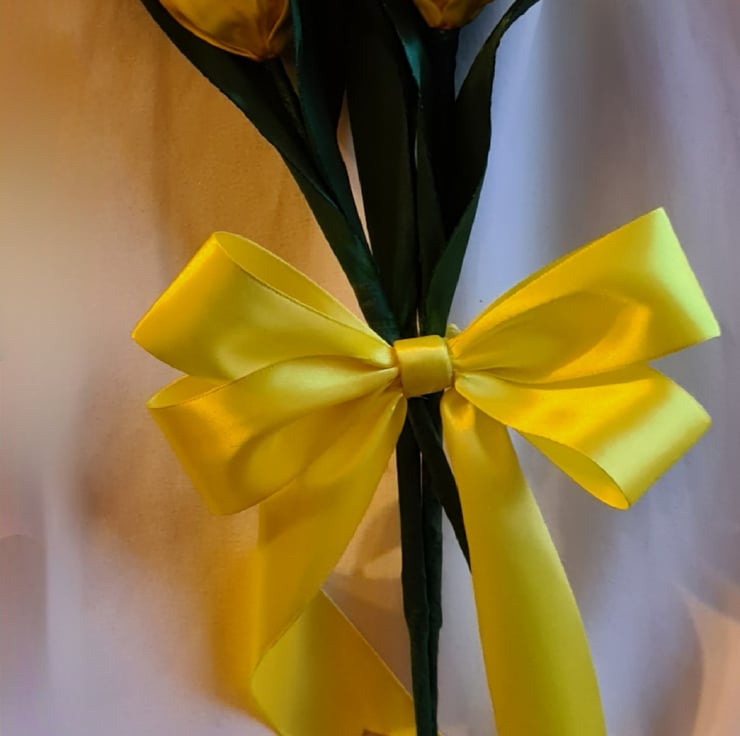 A lovely trio of Yellow Tulips made from Yellow and Green ribbon with floral wire stems (so can be gently bent and angled for your display). Gorgeous handmade Forever Florals that will outlast real flowers and make an unusual and unique keepsake gift.