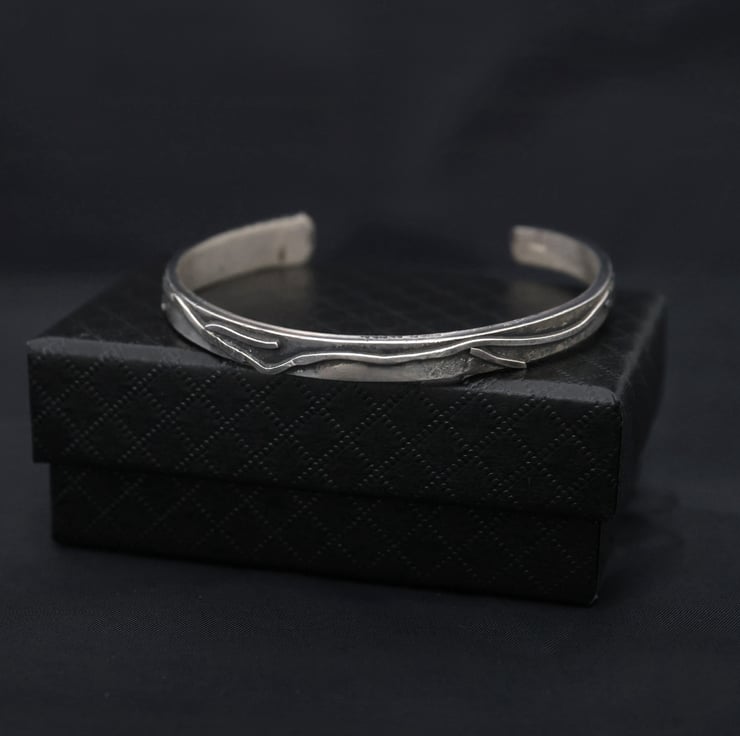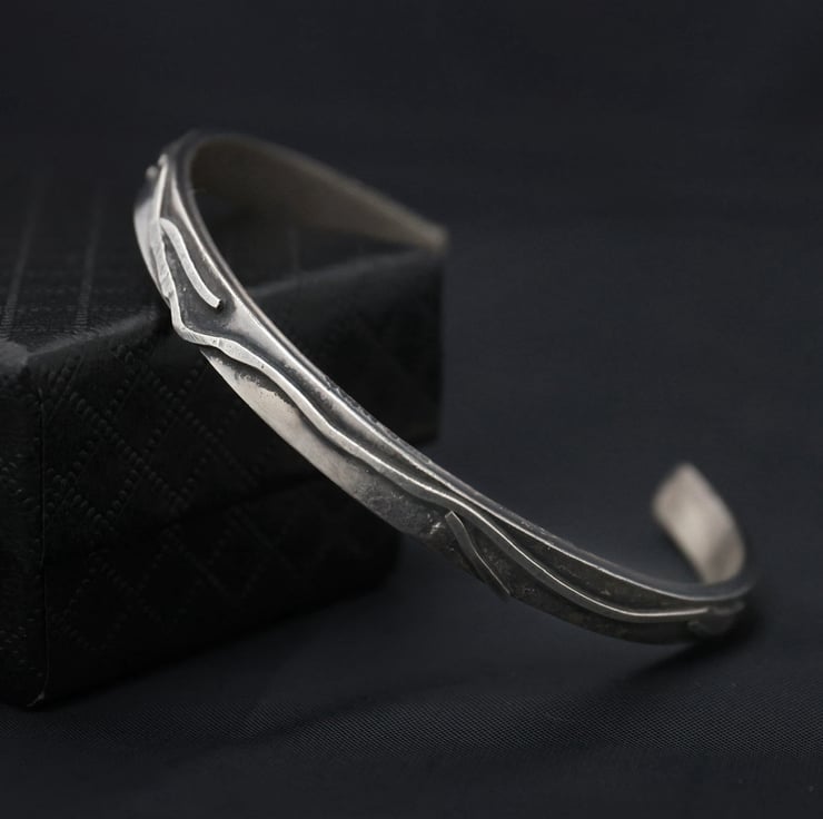 This is a hallmarked Sterling silver cuff bracelet. It has vine like wire soldered onto it. It has been oxidised to accentuate its details