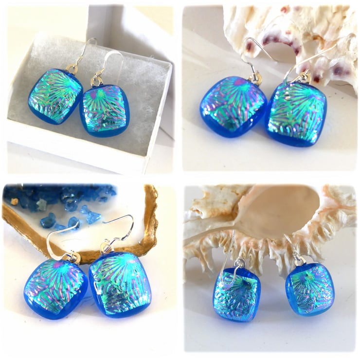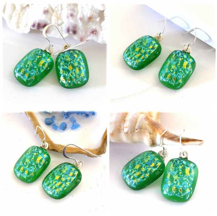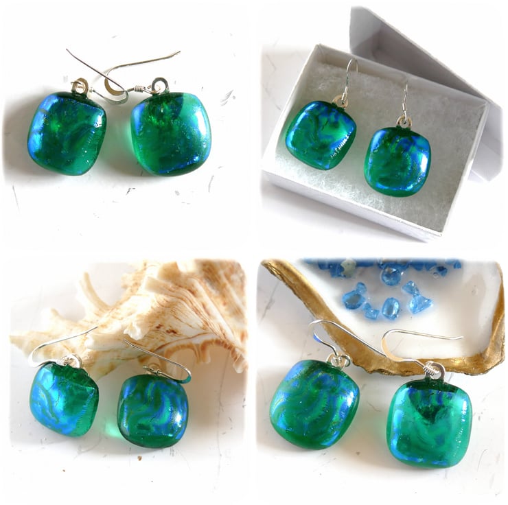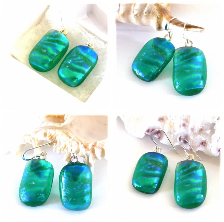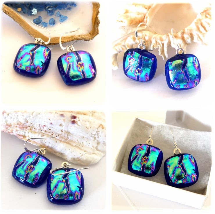 I've taken several photos of the earrings to try to show you the colour which changes in the light. this is a feature of wonderful dichroic glass.