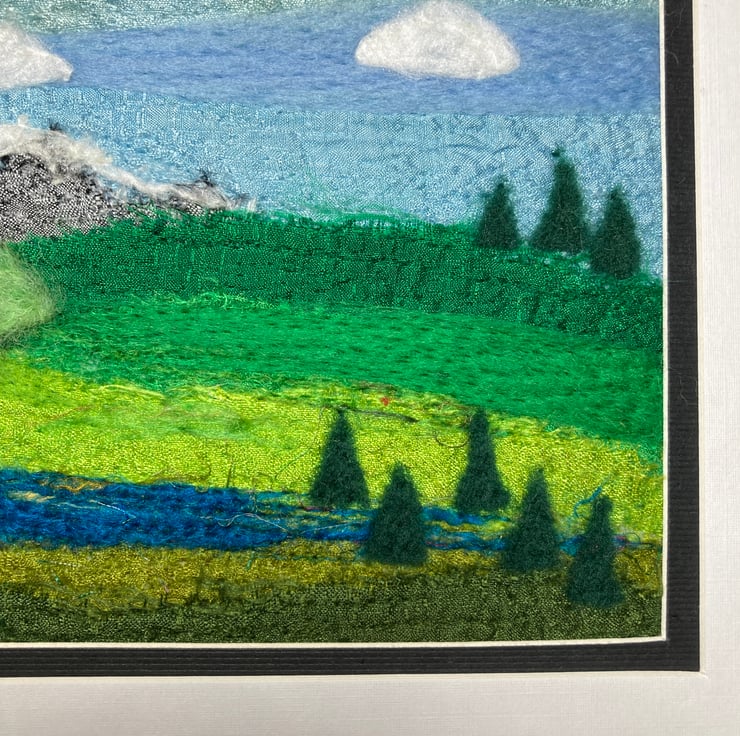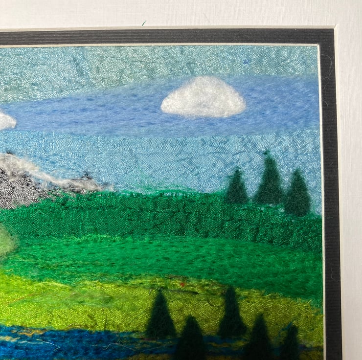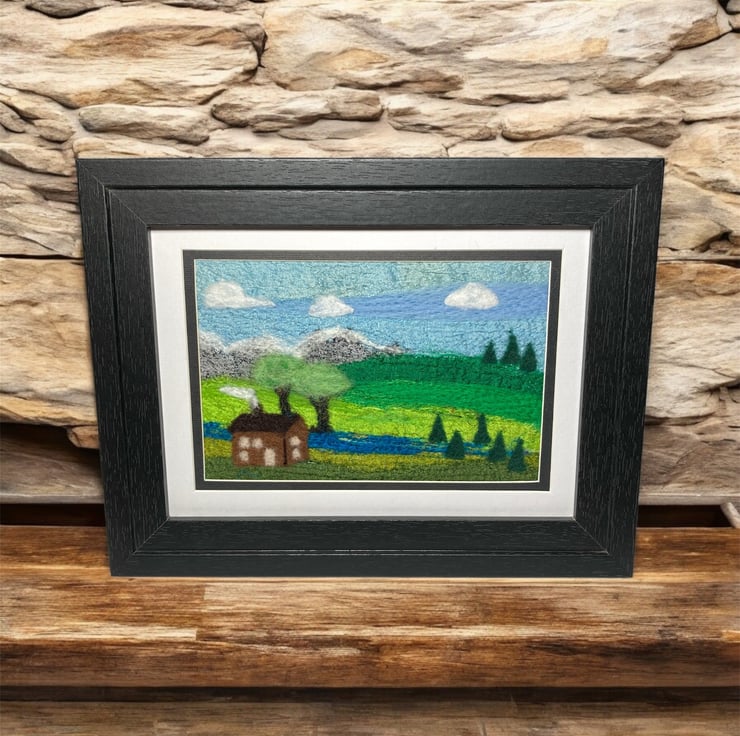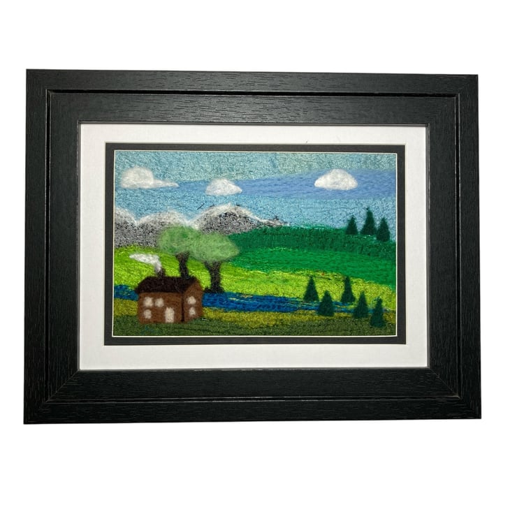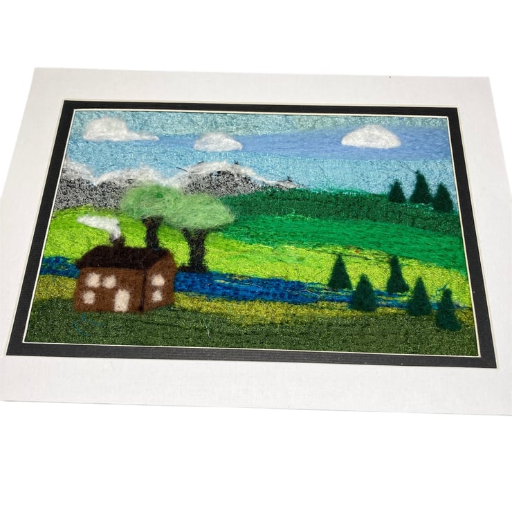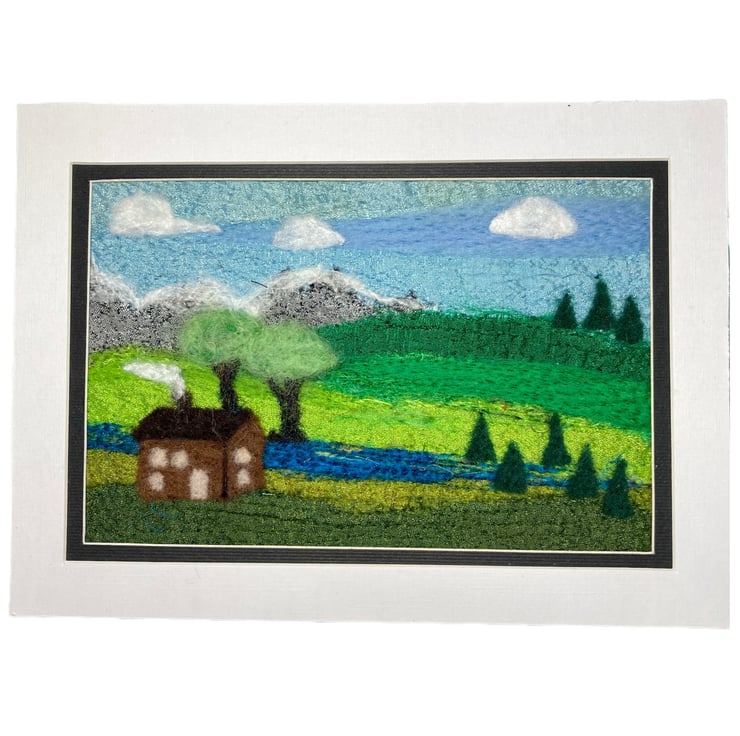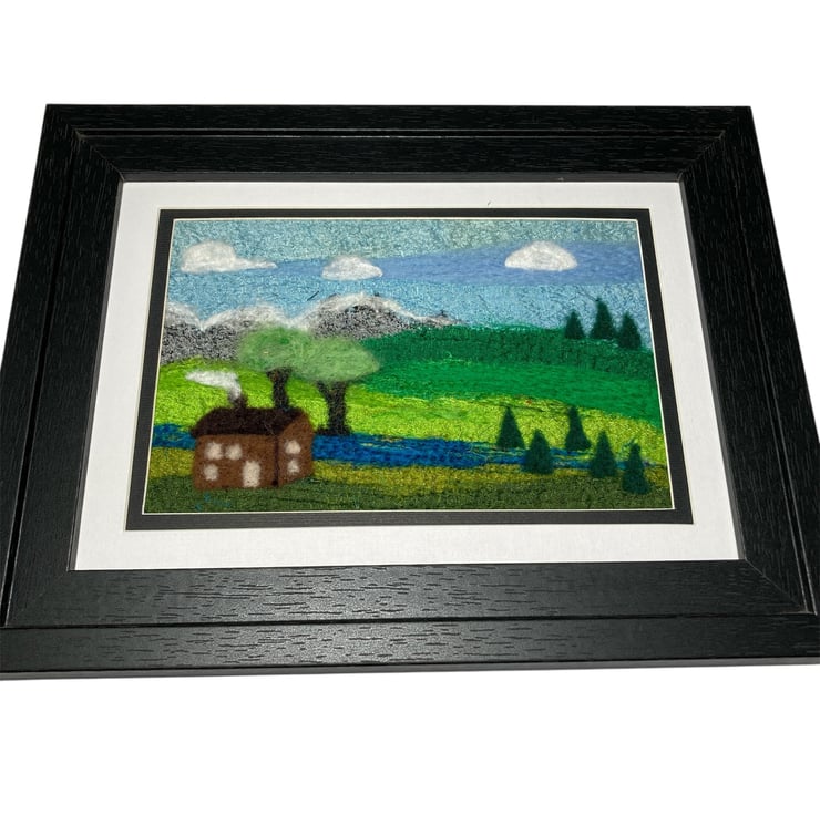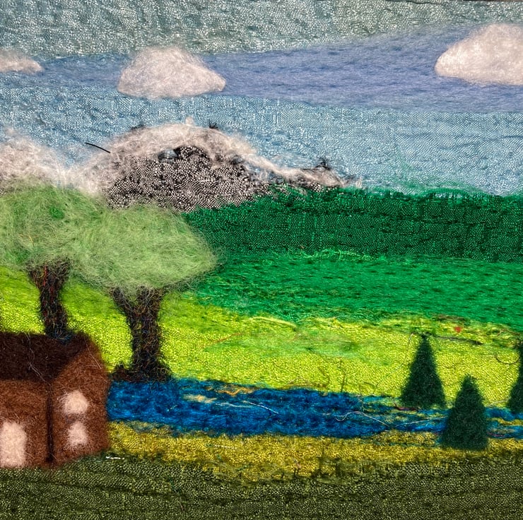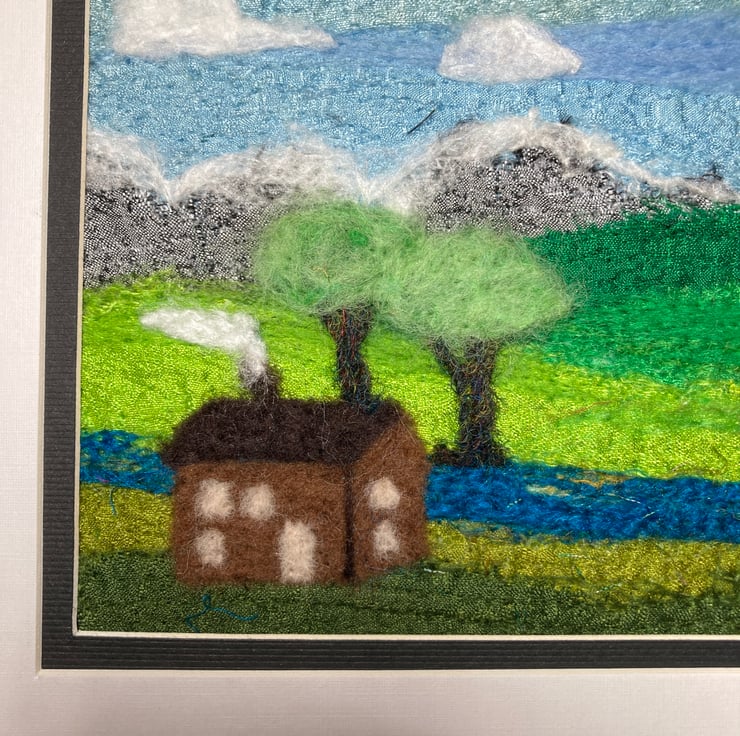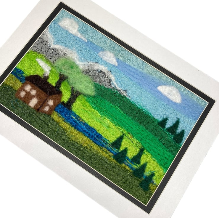 This beautiful textile art picture of a country cottage has been created using strips of coloured silk fabric blended with wool and silk fibres. The silk fabric has been needle felted to a felt base to create the background of the picture with additional wool and silk fibres added to the surface to blend the colours together and add texture. The cottage has been added using wool felt. The needle felting process binds the fibres and fabric together without the need for stitching and adds texture to the surface of the picture.