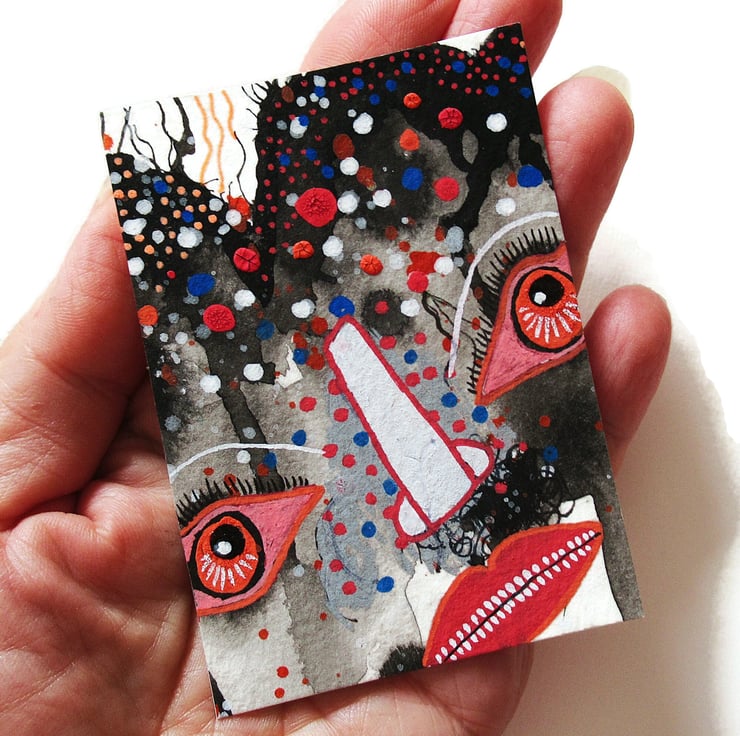 Whimsical, strange, curious - masterpiece of weird art. Unique ACEO in watercolour, ink and drawing pens on lightly textured, quality watercolour paper. Raw, weird, abstract portrait miniature art, measuring the usual 2.5 x 3.5 inches. It would look fab in a tiny frame, or with some other ACEOs in one frame for a larger artwork. It will be discreetly signed on the front by Bea before shipping. ACEOs / ATCs (art trading cards) are fun to collect, and are an affordable way to grown your original art collection - they also make super original art gifts.