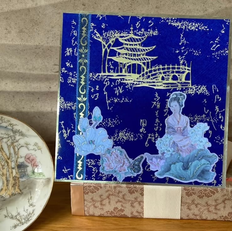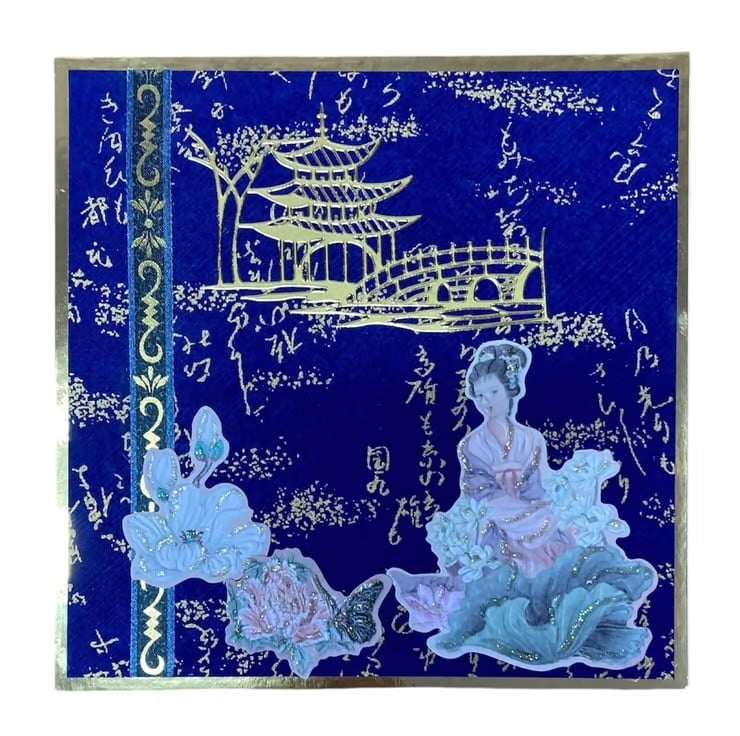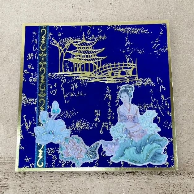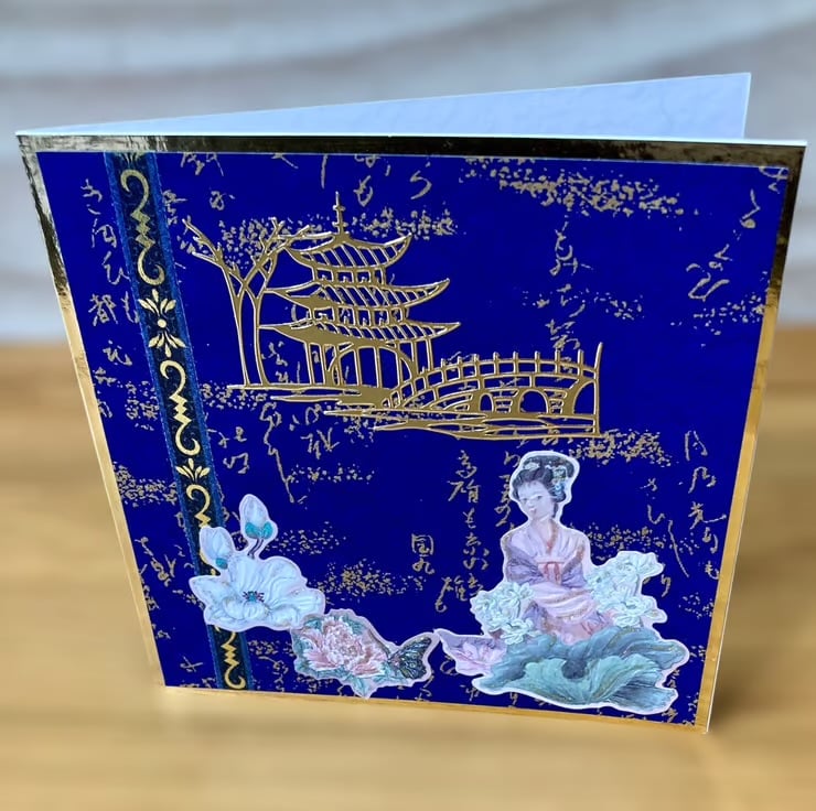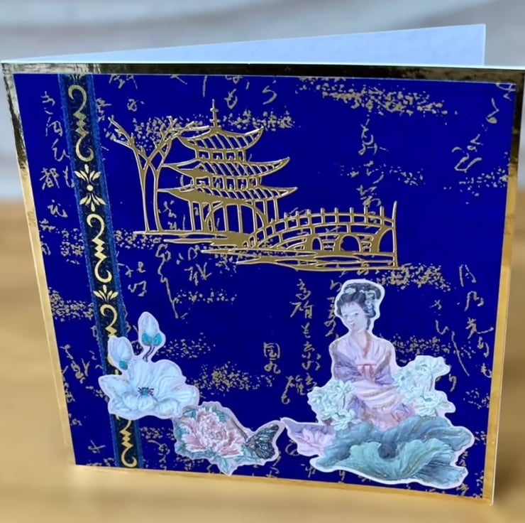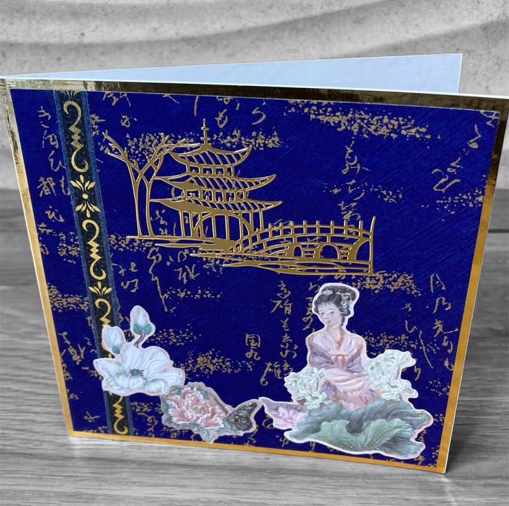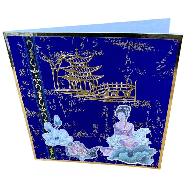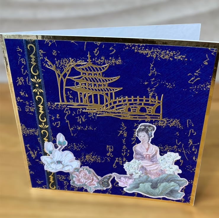 This Japanese inspired card features a gold card base which has been layered with chiyogami paper in a deep blue decorated with gold. A colourful die cut image of a geisha and along with flowers have been applied. A delicate die cut pagoda in gold has been added.