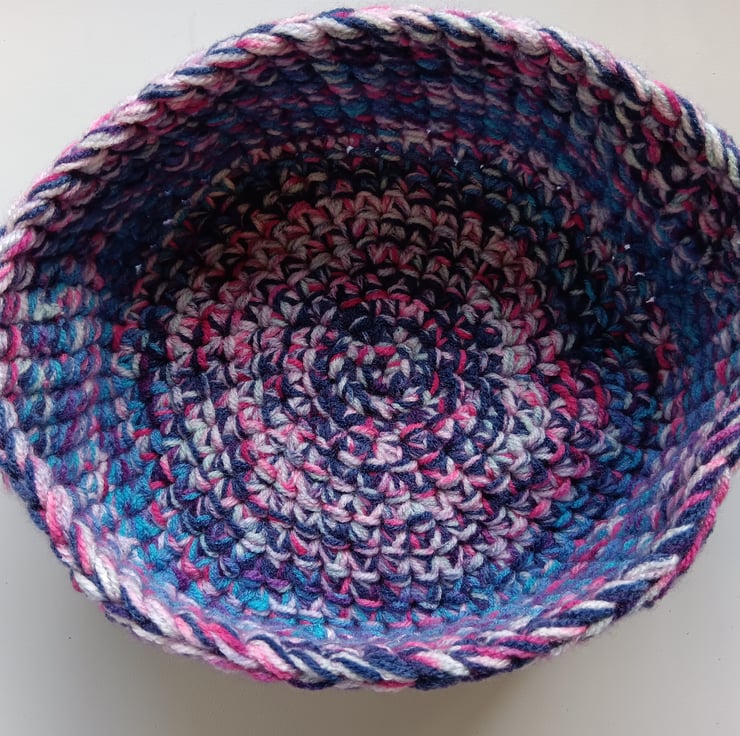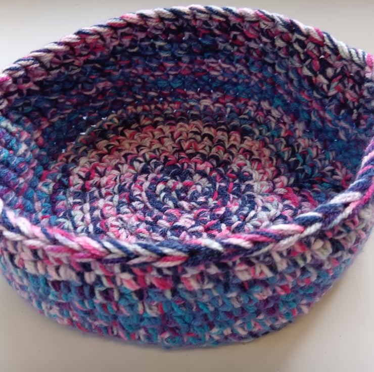NEW SHOP! I love crocheting and creating beautiful and practical pieces and sourcing good quality yarns. This basket is made from a luxury variegated yarm. I have them in my bedroom to hold toiletries, makeup and trinkets, in my home office to hold pens and stationery and in my kitchen to hold all the bits and bobs that gather there. Enjoy unique work by Handmade by Joy - browse my shop for more, new items added regularly! BONUS - free postage!
