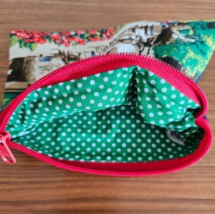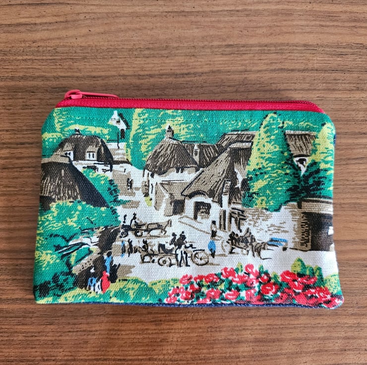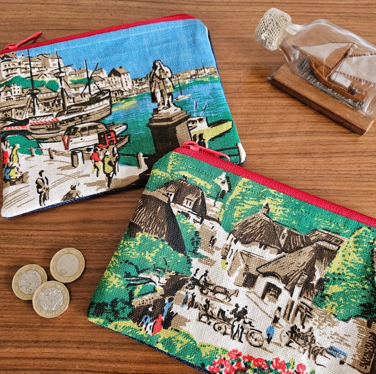 Zip pouches made from a vintage souvenir teatowel depicting scenes of Paignton in Devon. Fully lined with coordinating cotton fabrics, a denim backing and I've added red zips to give a pop of colour. Useful pouches, perfect as handbag organisers, ear buds or headphones or as storage for special things.