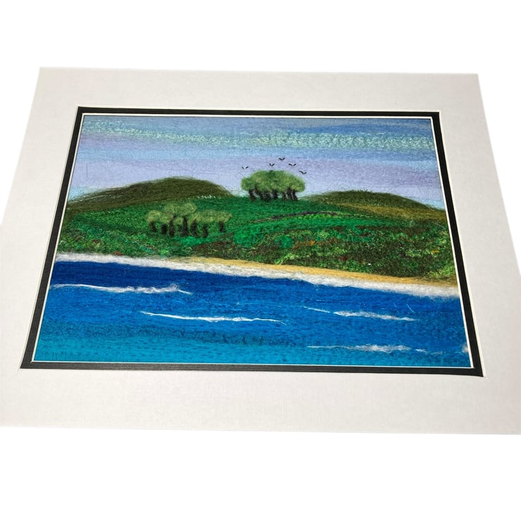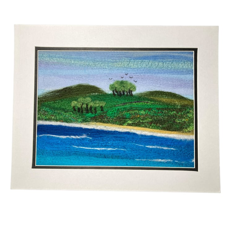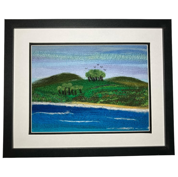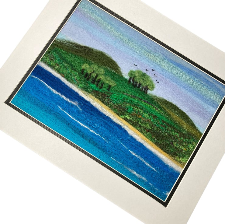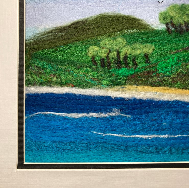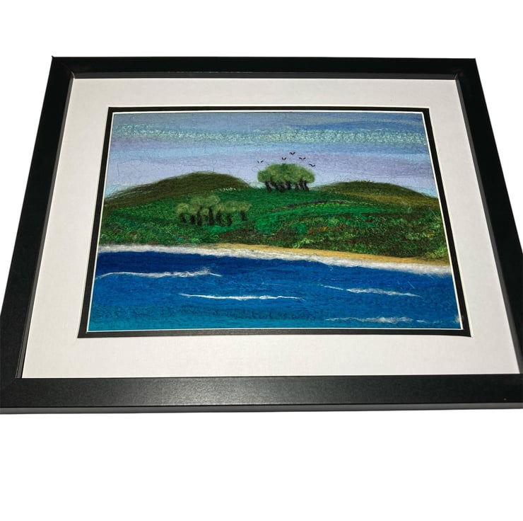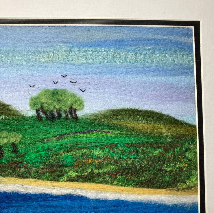 A wonderful textile art picture of the shoreline made using fabric and fibres. The background of this picture has been created using strips of silk fabric needle felted to a felt backing sheet Additional wool and silk fibres have been added to blend the colours and add detail to the picture. The needle felting process binds the fabric and fibres without the need for stitching.