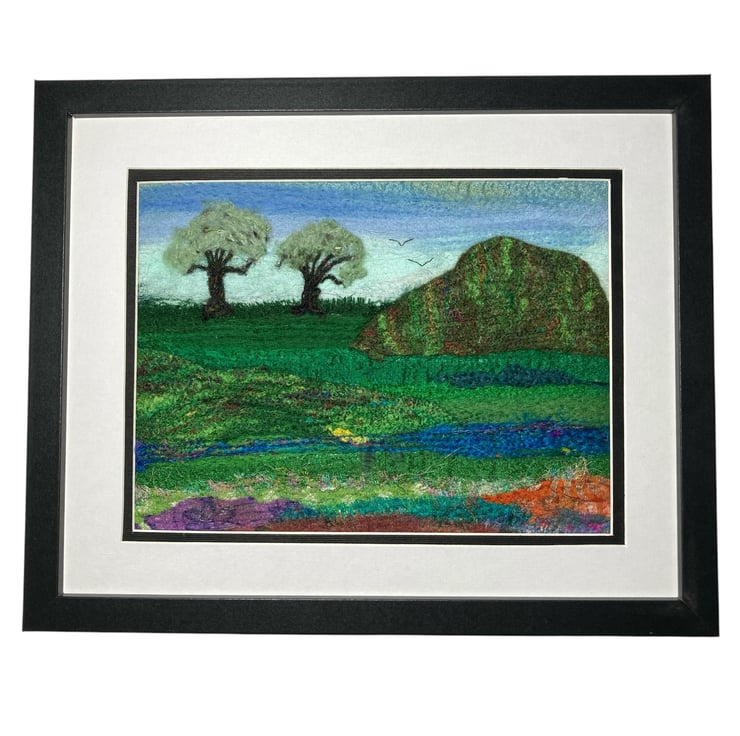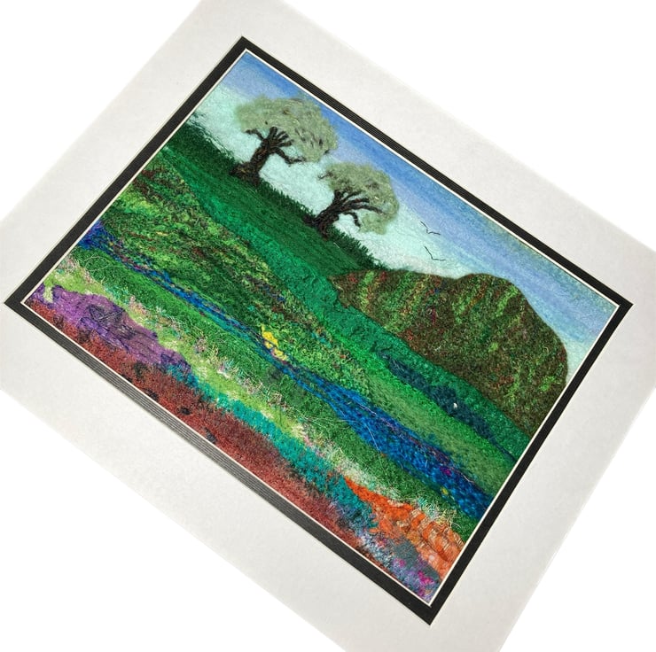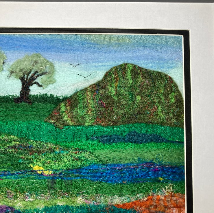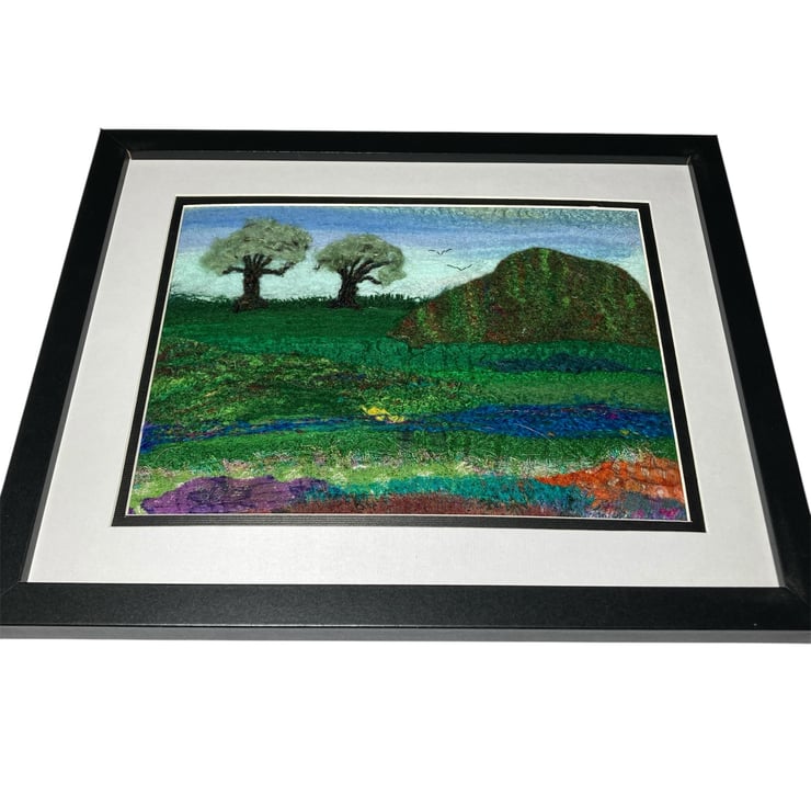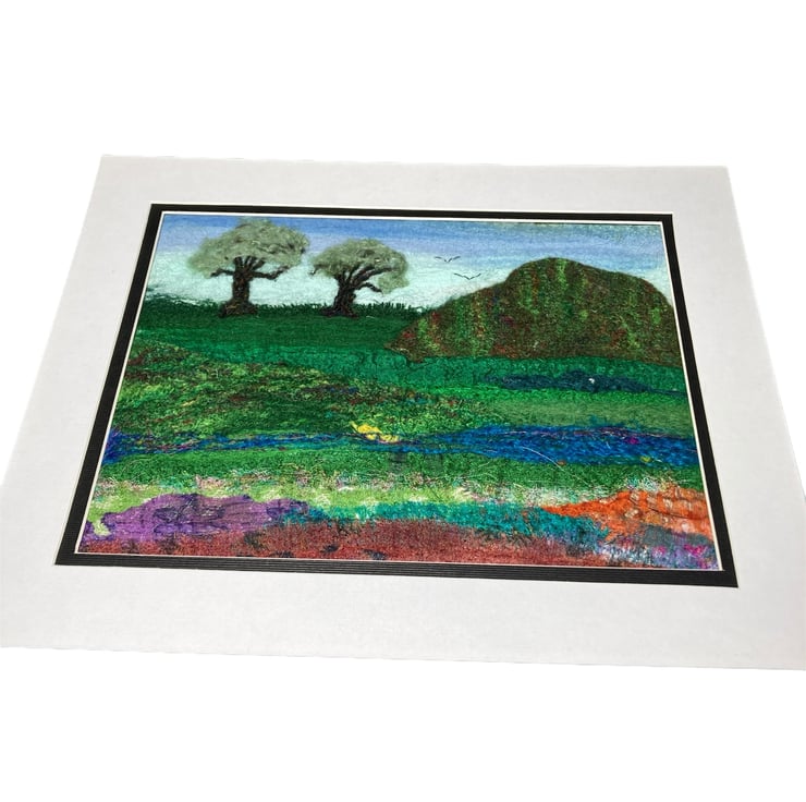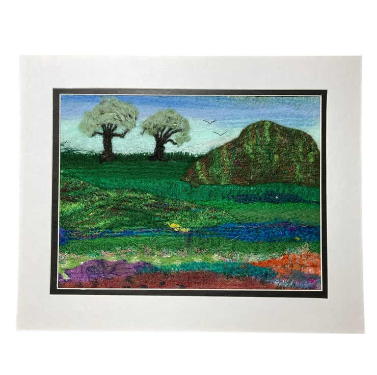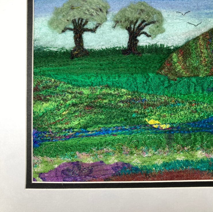 A country scene created from wool and silk. This textile art picture has been made using strips of coloured silk fabric blended with wool and silk fibres to create the background. The fabric and fibres have been needle felted to a felt backing sheet which binds the fibres and fabric together without the need for stitching and adds texture to the surface of the picture. Further wool and silk fibres have been used to add the detail of the trees and stream.