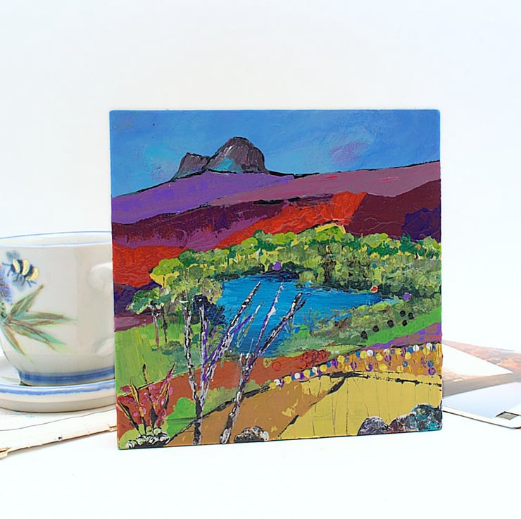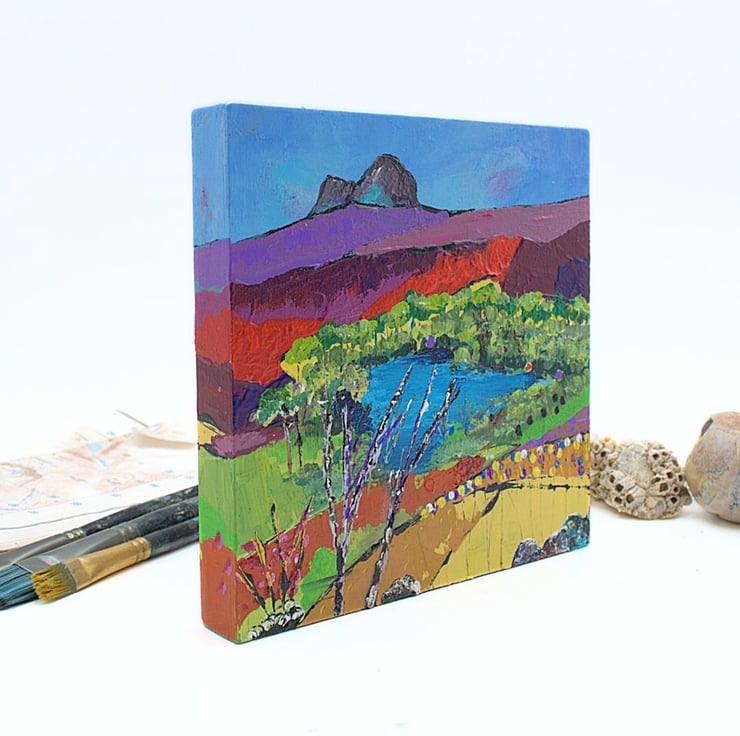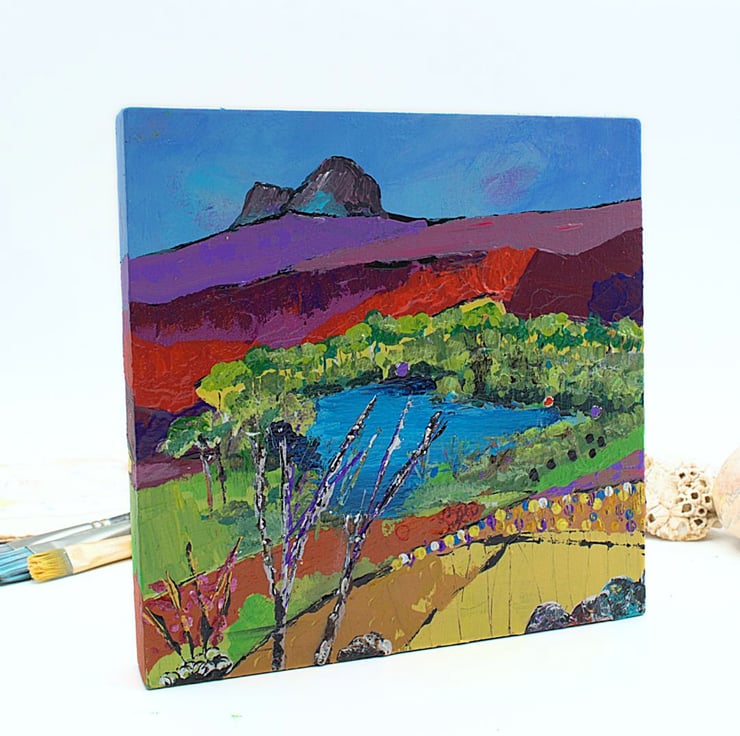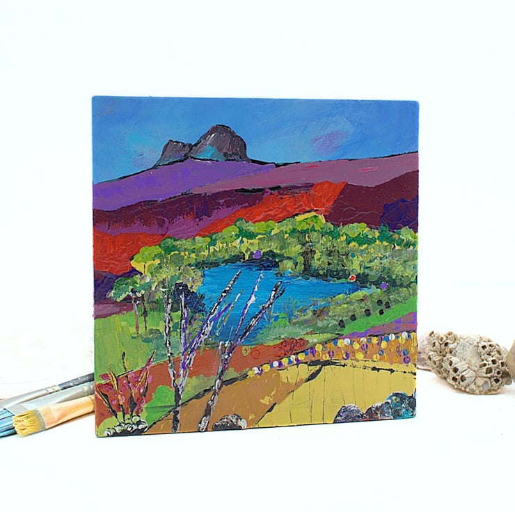 This small Scottish landscape painting is ready to hang. In the distance against a clear blue sky, we can see the great mountain Suilven towering into the heavens. It over looks the hills, bogs and lochs across its vast area. This semi-abstract piece has been completed using professional quality acrylic paints which have been applied using a mix of brushes, knives and twigs.