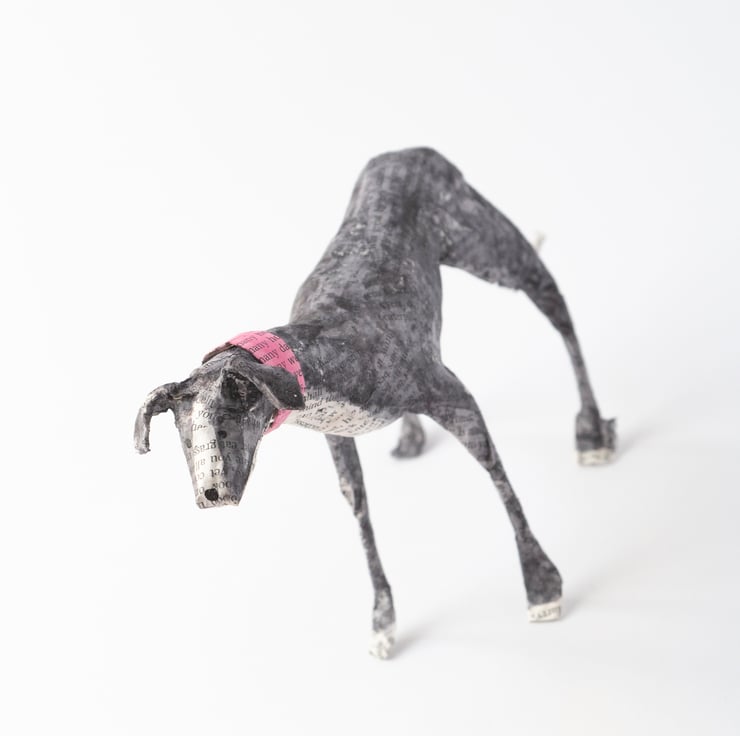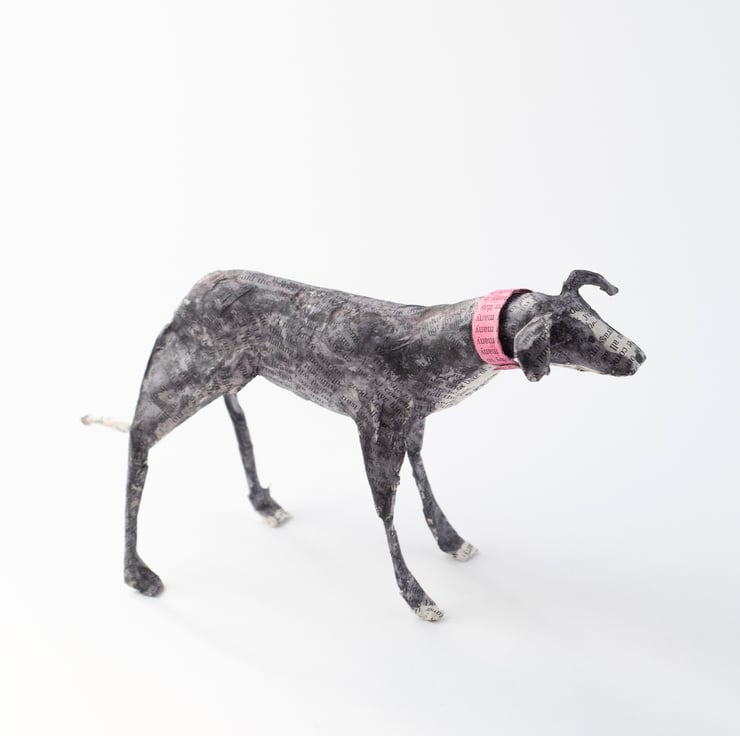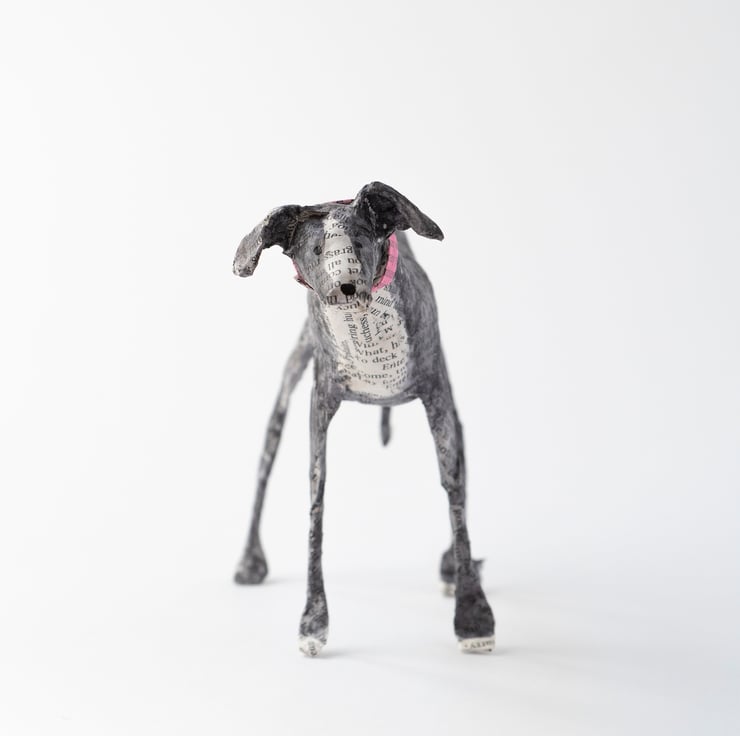 A handmade paper mache folk art sculpture of a A handmade paper mache folk art sculpture of a pointy dog. It is created from paper mache using book paper and watercolour and is approx 11cm high.