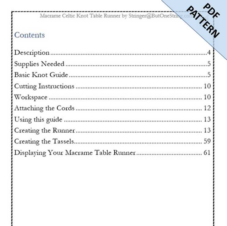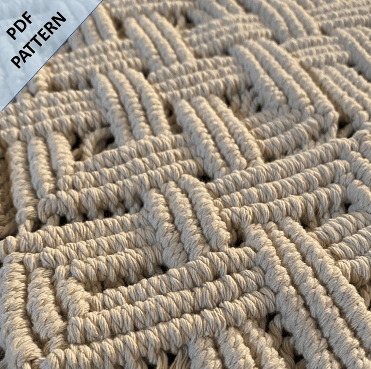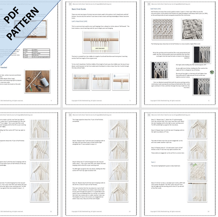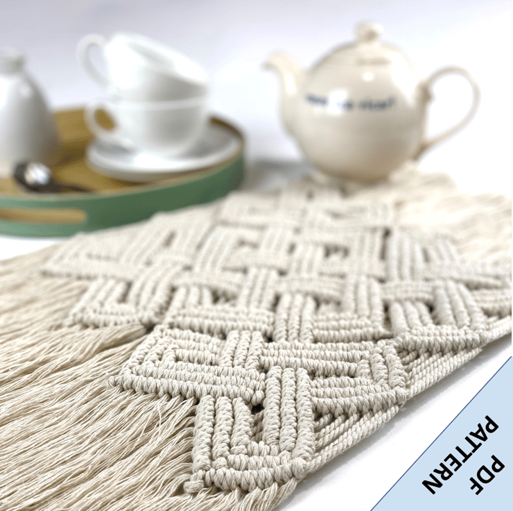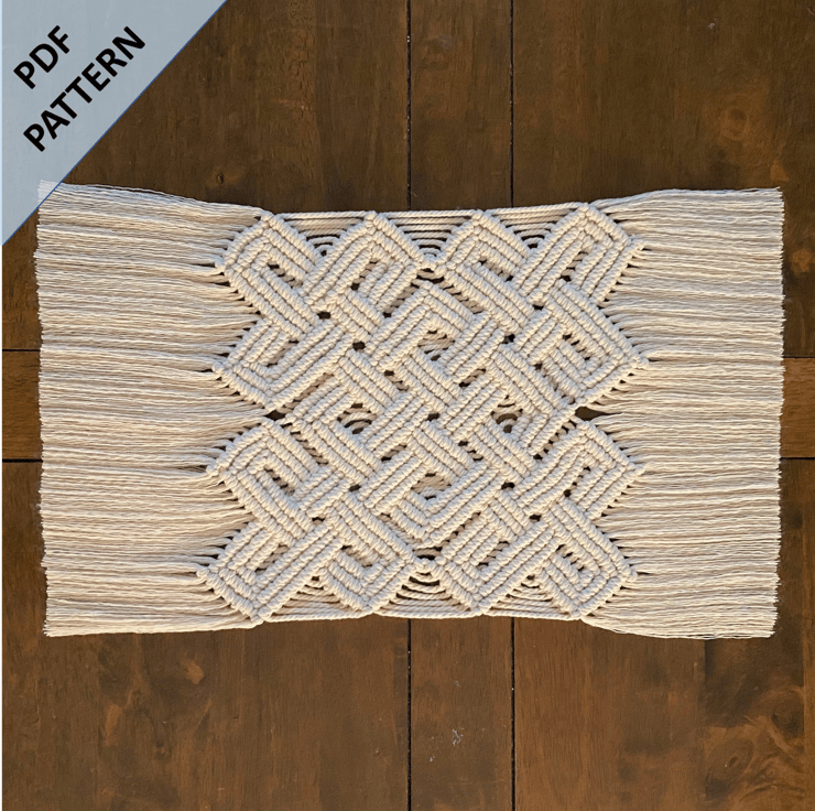 Macrame 'Pan Celtic Knot' table runner pattern. This design is a perfect project for intermediate macrame crafters or beginners looking for something a little more challenging. Approximate size once completed: 58cm x 26cm.