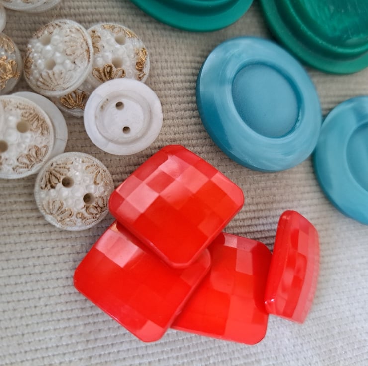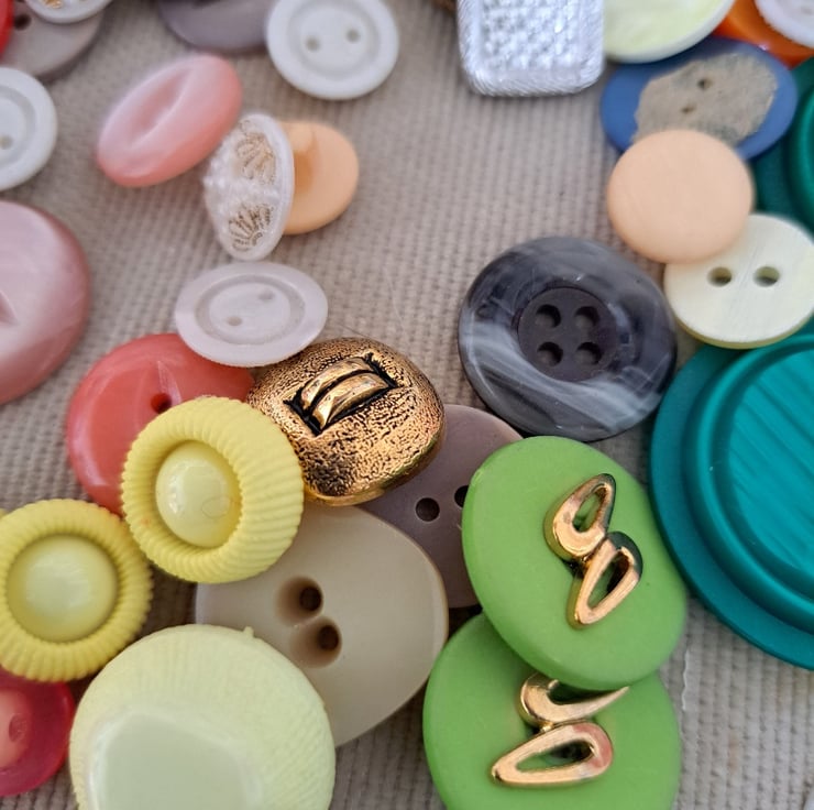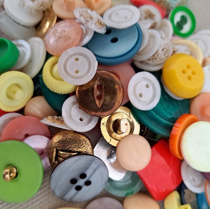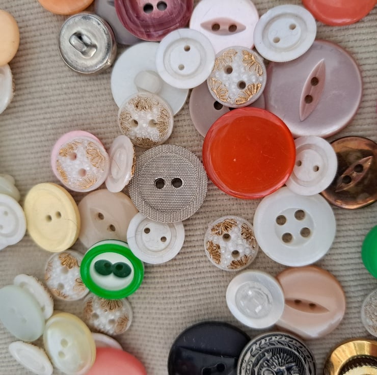 Approximately 130 assorted vintage buttons in a variety of delightful shapes and sizes. Not all singles by any means: there are matching groups, including a very large number of little nobbly white ones with gold patterns. Button lovers, you know it makes sense.