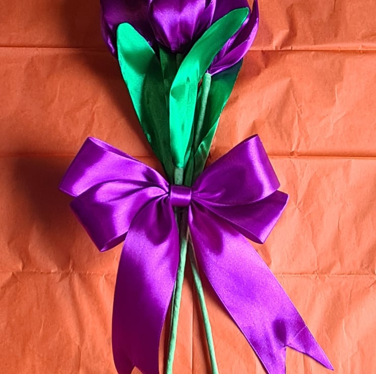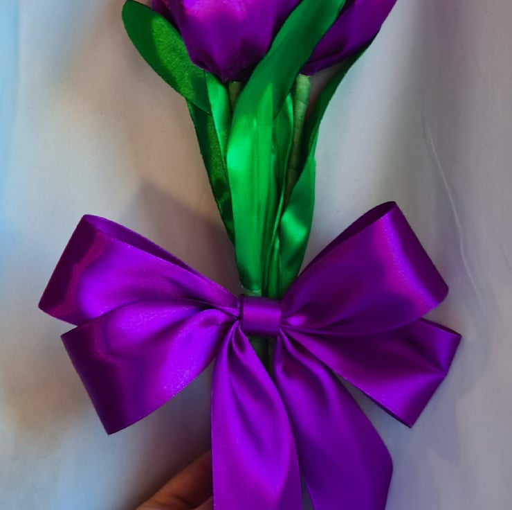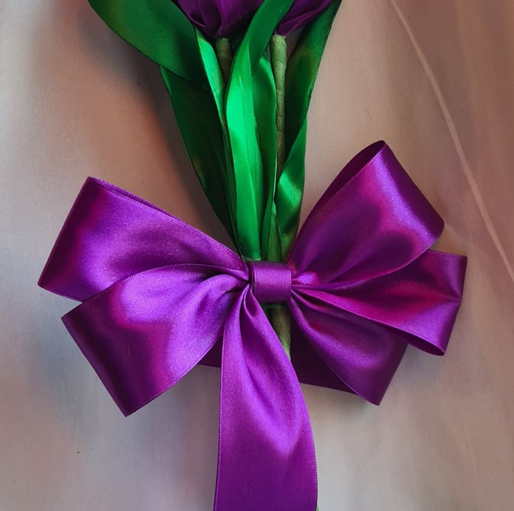 A lovely trio of Purple Tulips made from Purple (more a Pinky-Purple shade) and Green ribbon with floral wire stems (so can be gently bent and angled for your display). Gorgeous handmade Forever Florals that will outlast real flowers and make an unusual and unique keepsake gift.