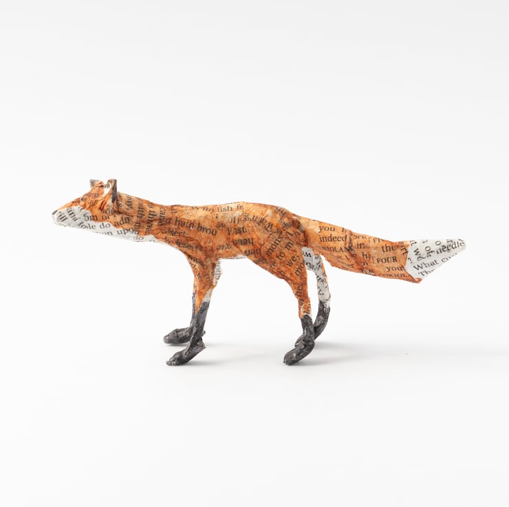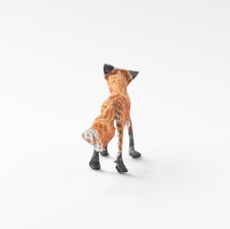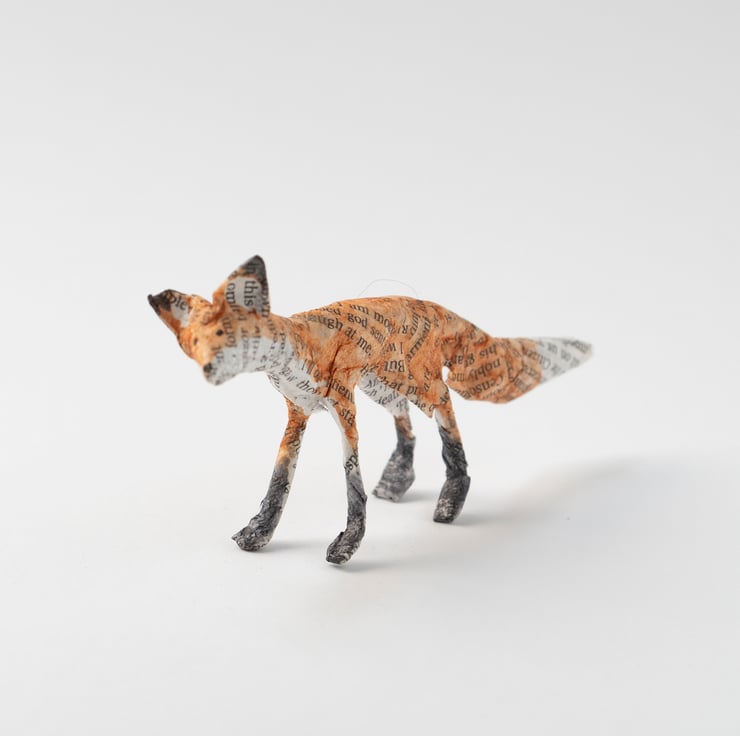 A handmade paper mache folk art sculpture of a tiny standing fox. It is created from paper mache using book paper, wire and watercolour and is approx 5cm high x 11cm long.