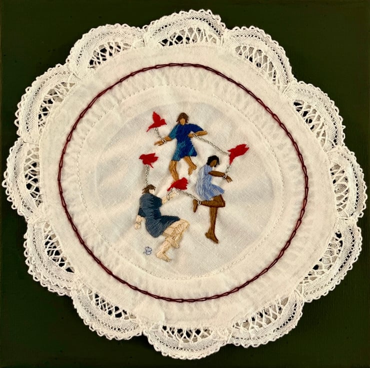 Unique and one-off, this hand-stitched piece is embroidered with fine cotton thread on vintage fabric.