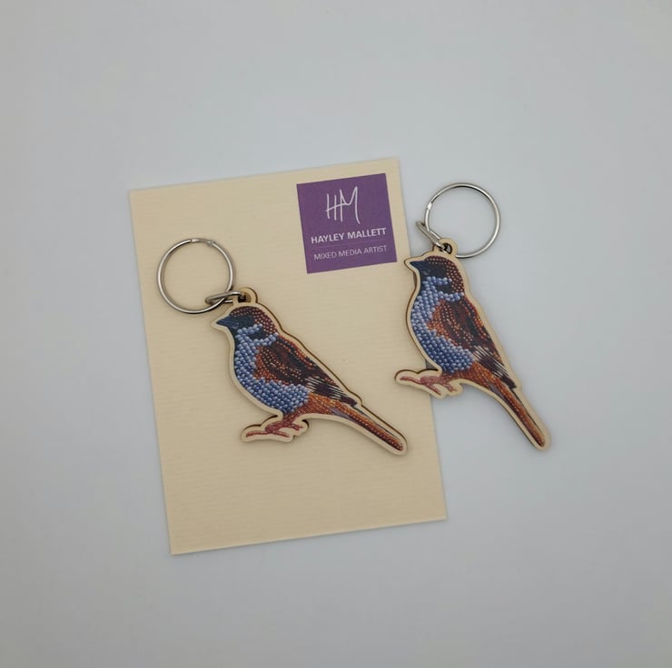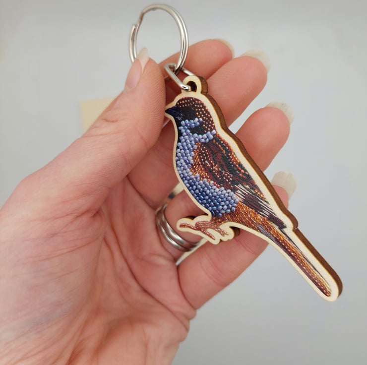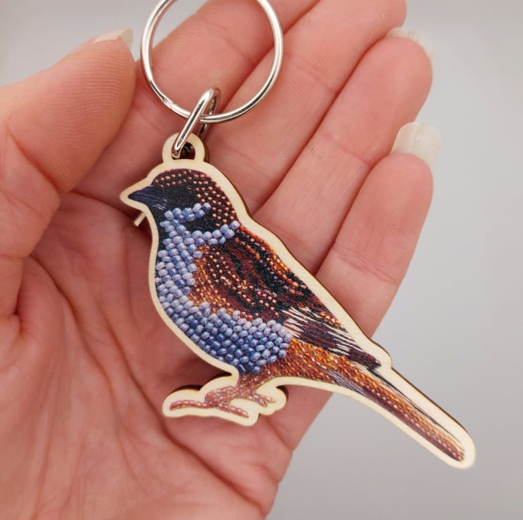 This charming wooden Eurasian Tree Sparrow keyring features a detailed design taken from one of my original bead embroidery artworks. A thoughtful gift for bird lovers, gardeners, or anyone who appreciates British wildlife, it’s sustainably made and beautifully crafted.