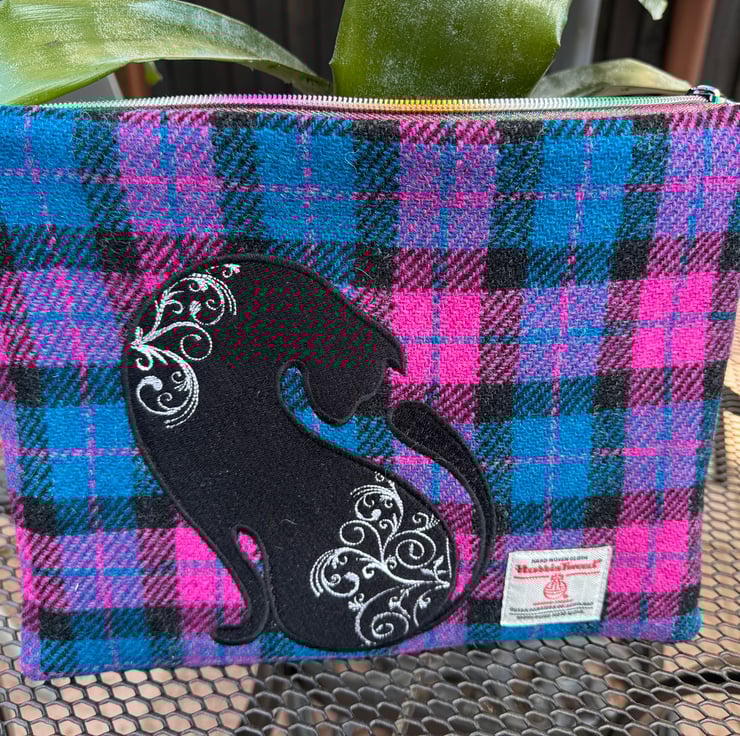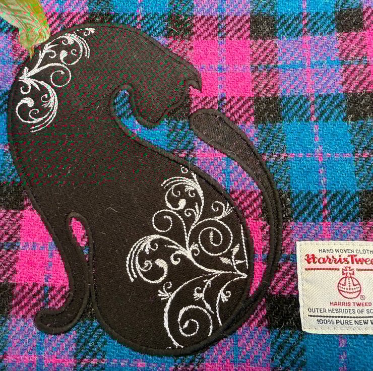 I embroidered this stunning black cat onto Harris Tweed some time ago and waited for inspiration as to what to make - today was the day!