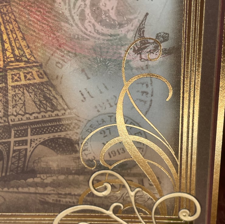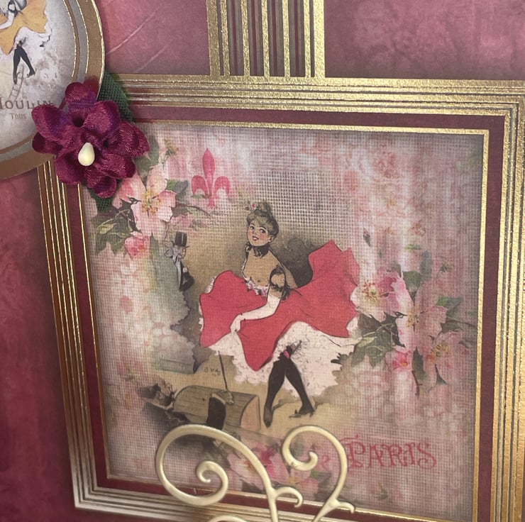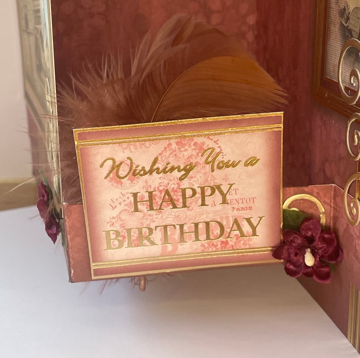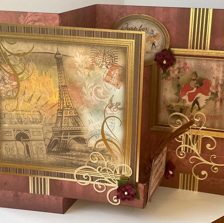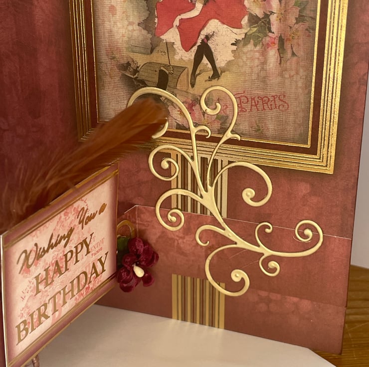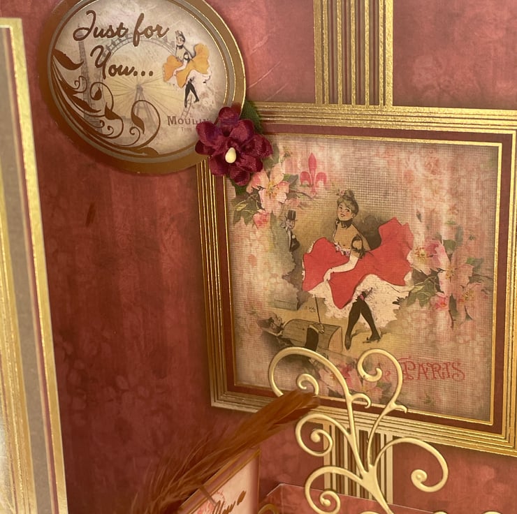 Something for the traveler, a bit of Parisian glamour. This 18.5x 14.4cm card is full of Parisian detail. The card is a fold back design with a band across the bottom. It's main picture is of Parisian landmarks such as the Eiffel tower, Arc de Triomphe and the Sacre Coeur. This is enhanced with gold borders and gold swirls, a die cut swirl and flower is added for more detail. The smaller topper is an image from the Moulin Rouge, a beautiful Can Can dancer in a red dress. This is also edged in gold and has a greeting added which says Just for you, this has a pretty burgundy flower to the edge. The design is finished with a Wishing you a happy birthday greeting with more swirls,a flower and a feather. Something completely different to celebrate a birthday.