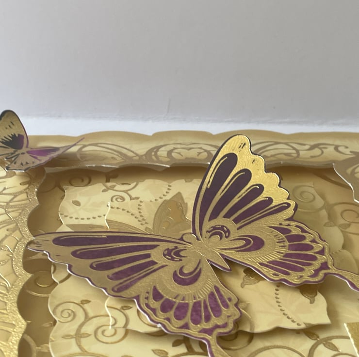 Something a bit different. This 15x15cm card has a fancy large scalloped edging. It has a fancy aperture in the front. There is a layered design in a matching cream and gold colour way. This feature swirls and butterflies embossed with gold foiling. The centre of the design has a large purple and gold foiled butterfly on it. The border around the aperture has more gold swirls, a greeting that says On your special day. There are flowers and butterflies in matching colours to finish the design. A beautiful and versatile design.